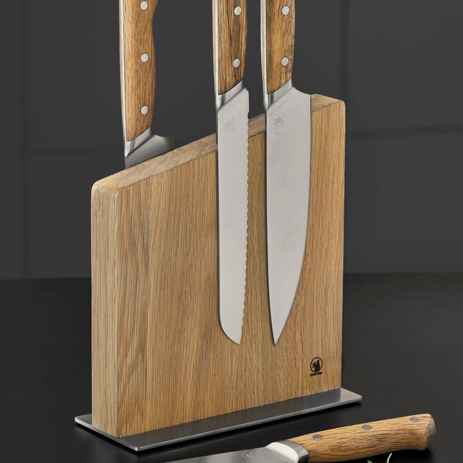 Den elegante knivblok i egetræ står på en plade af rustfrit stål og har skridsikre fødder. Der er en magnet inde i træblokken, og knivblokken fungerer på samme måde som en vægophængt knivmagnet. Der kan sættes knive på begge sider af blokken, hvilket giver mere plads til knive uden at optage for meget plads på køkkenbordet. Overfladen af egetræ er behandlet med naturlak, hvilket gør den glattere og mere modstandsdygtig over for knivmærker.Trædelen på varen er FSC®-certificeret egetræ (FSC-C166612).