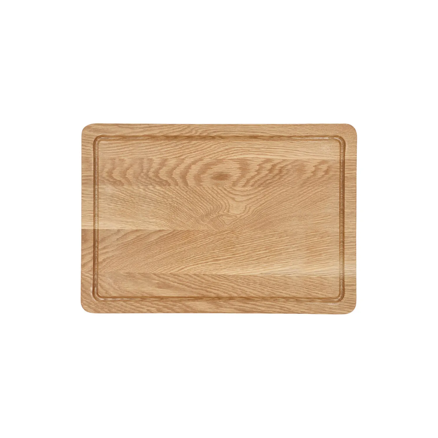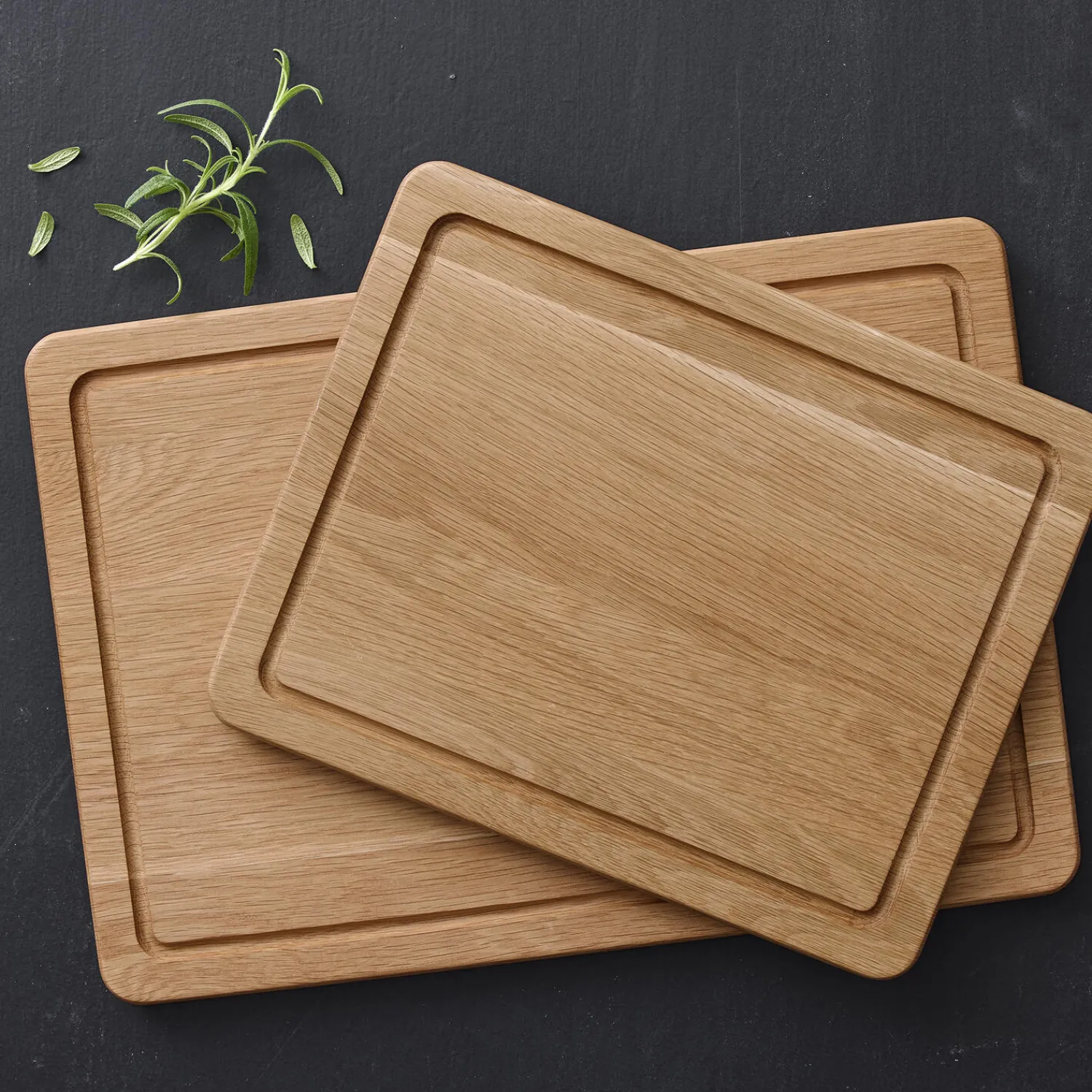 Det smukke og solide skærebræt er fremstillet af olieret eg og har mange anvendelsesmuligheder. Den ene side af skærebrættet er udstyret med en saftrille, der opsamler saft bl. a. fra kød, og den anden side er glat. Begge sider kan anvendes til udskæring og servering. Dette skærebræt er bl. a. velegnet til udskæring og servering af større stege samt anretning og servering af tapas. Læg aldrig dit skærebræt i blød. Vaskes med varmt vand og mild sæbe. Tåler ikke opvaskemaskine. Kan med fordel efterbehandles med madolie et par gange om året. Design: Hans Sandgren JakobsenVaren er produceret i FSC®-certificeret egetræ (FSC-C166612).