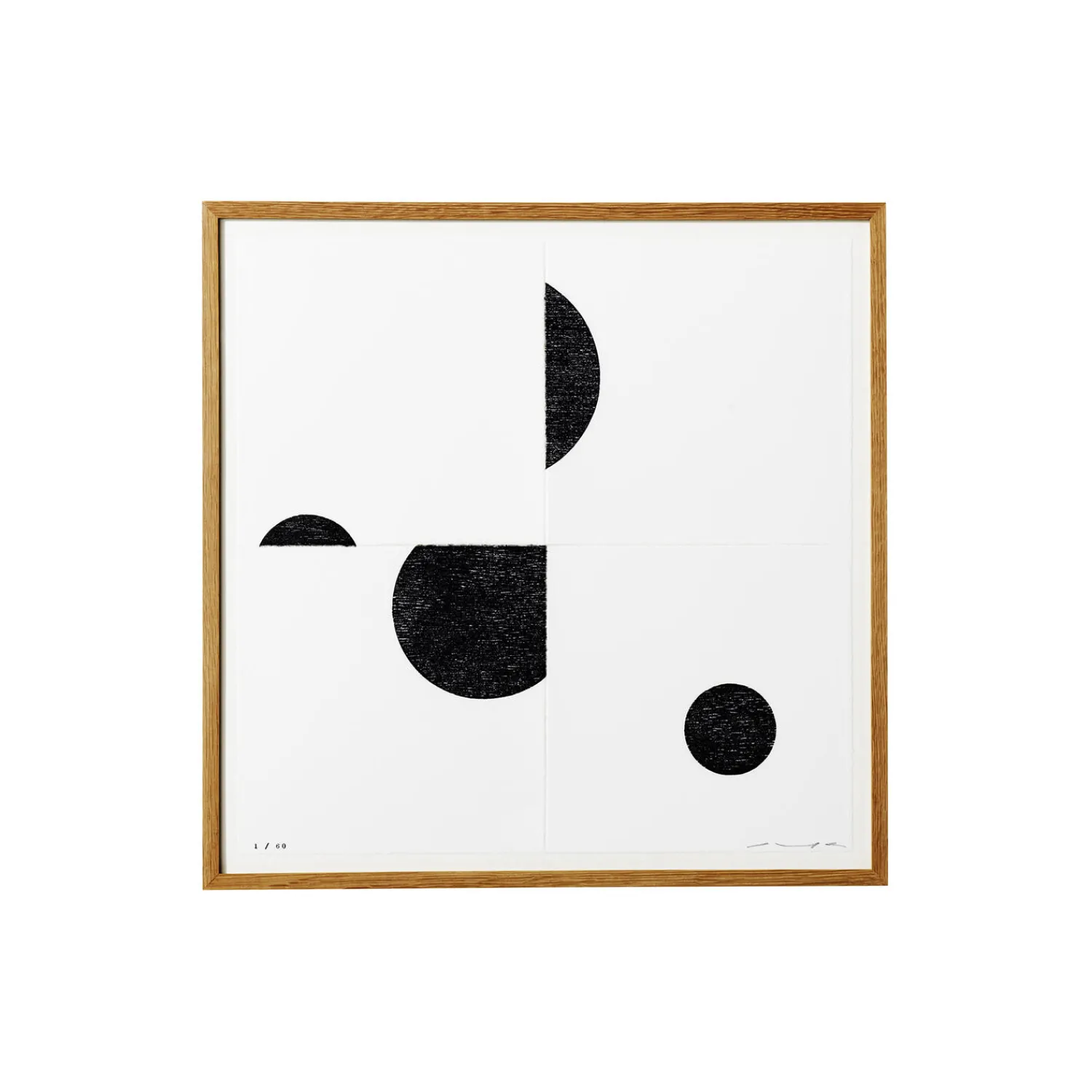 WOOD WORKS cut black print i blæk trykt på bambuspapir og ramme i eg fra MOTARASU. Farve: hvid/sort. Mål: 45×45 cm. Design: Masayuki Koitabashi.