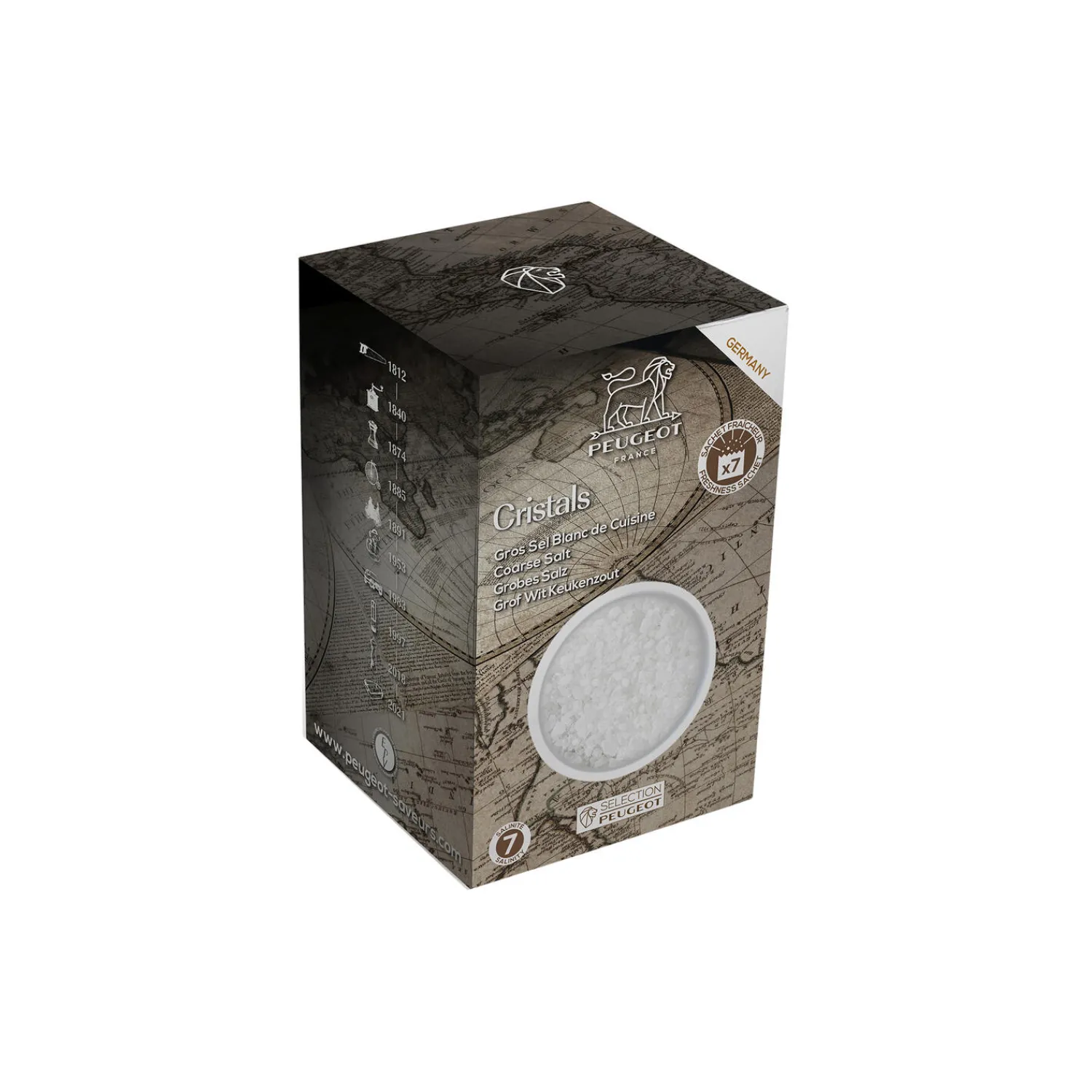 Groft kværnsalt fra Tyskland.350 gram – 7 breve a 50 gram.Saltkornene har en skinnende hvid farve og en krystallinsk form.