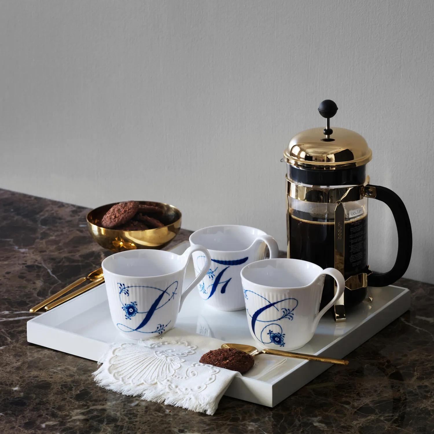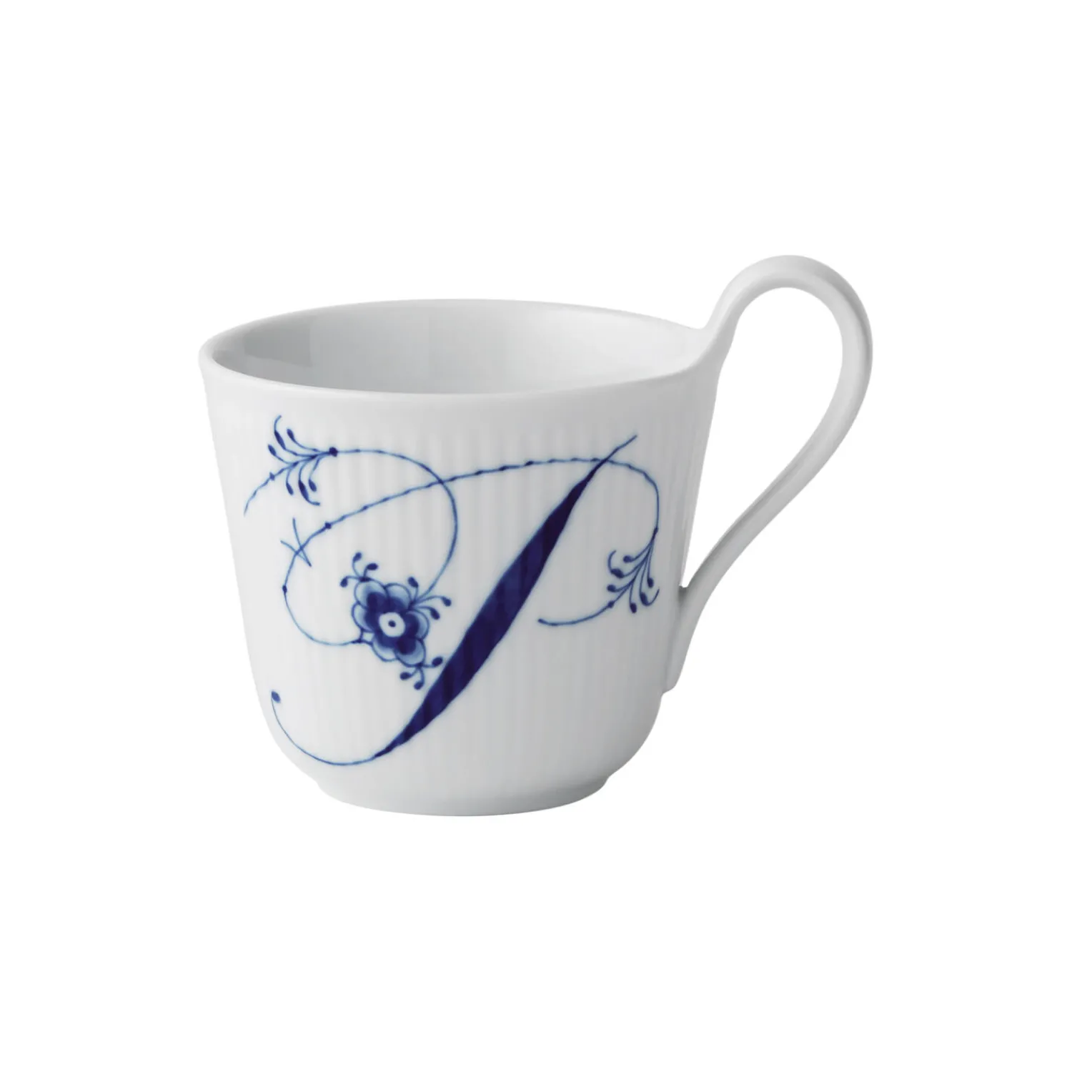 Alfabet krus P i porcelæn fra Royal Copenhagen. Det personlige Alfabet Krus på 33 cl prydes af et håndmalet P, hvorfra der vokser små palmetter og en stiliseret blomst. Drej koppen i hånden, og bagsiden åbenbarer sig med en delikat, blåmalet detalje af florale elementer, som bærer tydelige referencer til Musselmalet Riflet-mønsteret. Brug det charmerende krus til enhver slags varm drik.