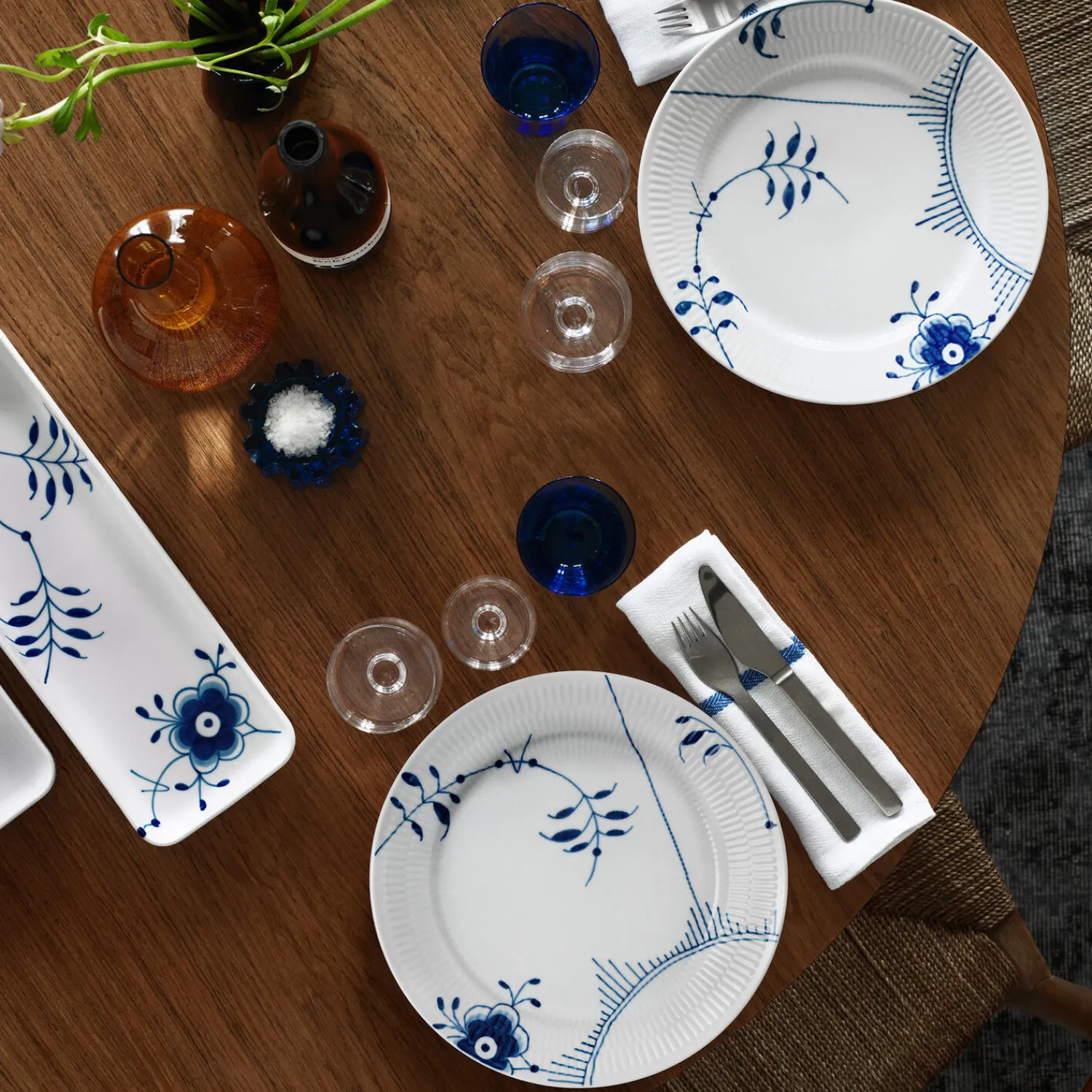 Blå Mega Riflet fad i porcelæn fra Royal Copenhagen. Dette smukke, rektangulære fad på 36 cm i Blå Mega Riflet skaber elegante serveringer af tapas og andre små retter. De håndmalede palmetter mødes af en smuk blomst, der gavmildt draperer sine kronblade ud over fadets kant og giver et anderledes udtryk. Lad fadet være centrum i en personlig borddækning, hvor du kombinerer dele fra forskellige Royal Copenhagen stel.
