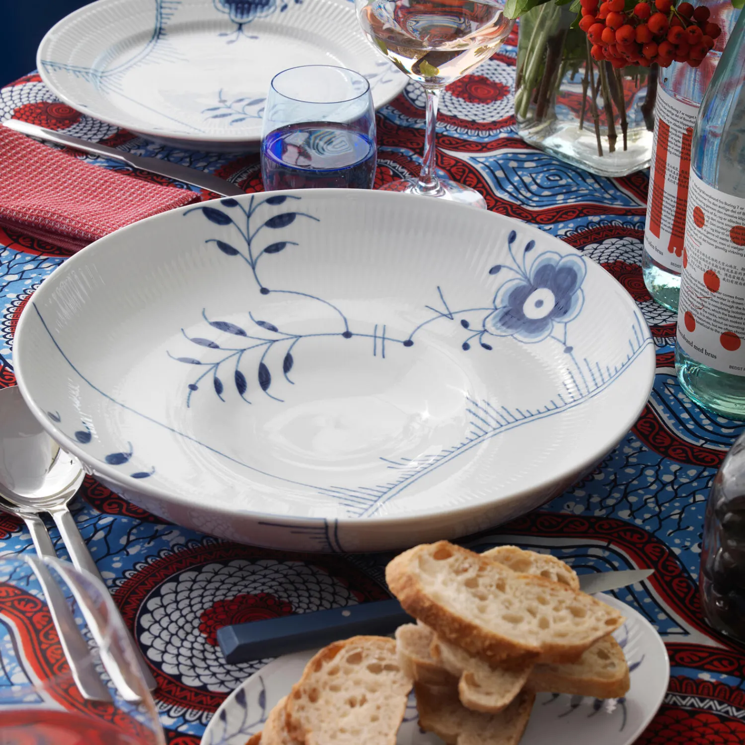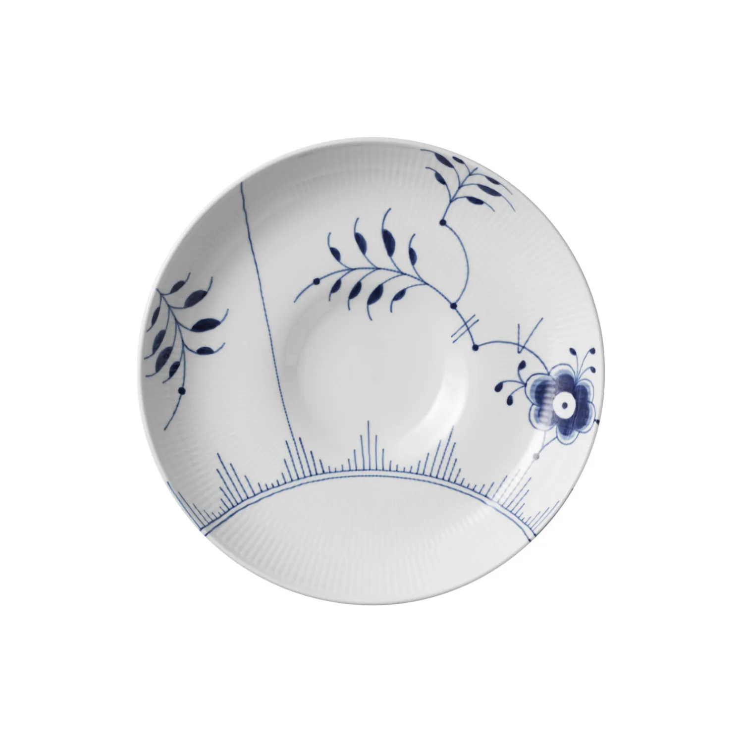 Blå Mega Riflet fad i porcelæn fra Royal Copenhagen. Det store fad på 34 cm i det håndmalede Blå Mega Riflet-mønster står på en lille søjlefod, der diskret hæver skålen over bordet. Skålen er smuk i sig selv, fyldt med frugt, eller som salatskål. En uundværlig tilføjelse til en samling af Blå Mega Riflet.