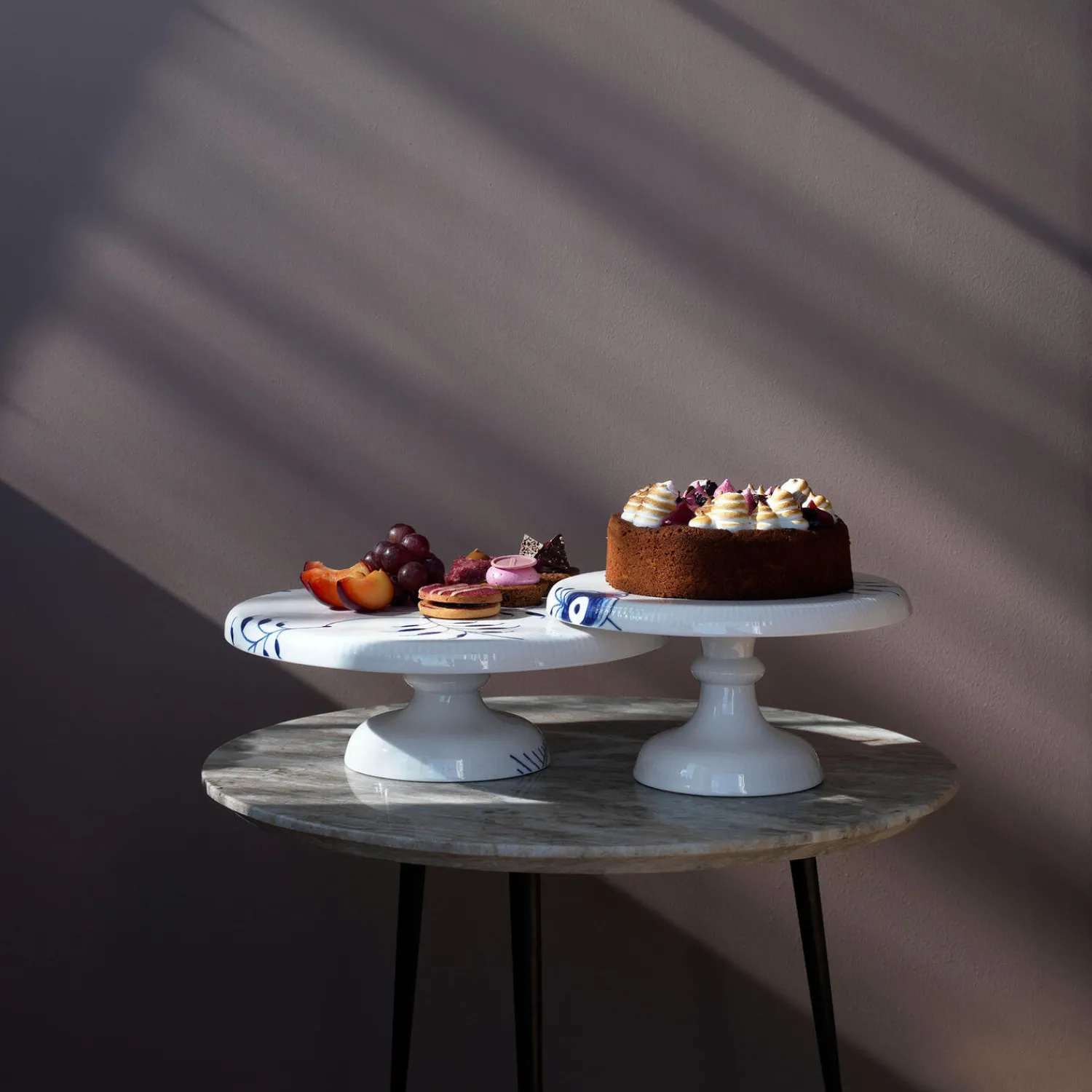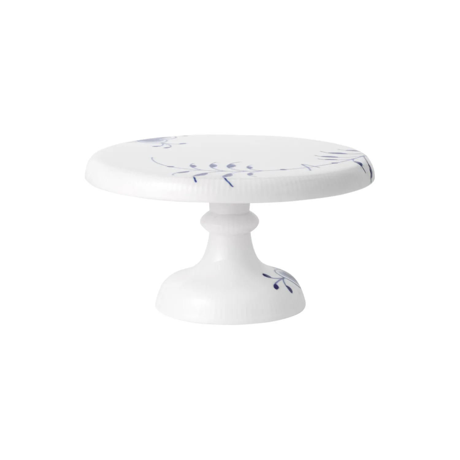 Blå Mega Riflet fad på fod i porcelæn fra Royal Copenhagen. Blå Mega Riflet Fad på fod findes i to størrelser, og på det mindre kagefad på 23 cm hæver en lidt højere søjlefod enhver sød servering til et nyt niveau. Fadet er dekoreret med det håndmalede mønster fra Blå Mega Riflet og er et smukt omdrejningspunkt på kagebordet.