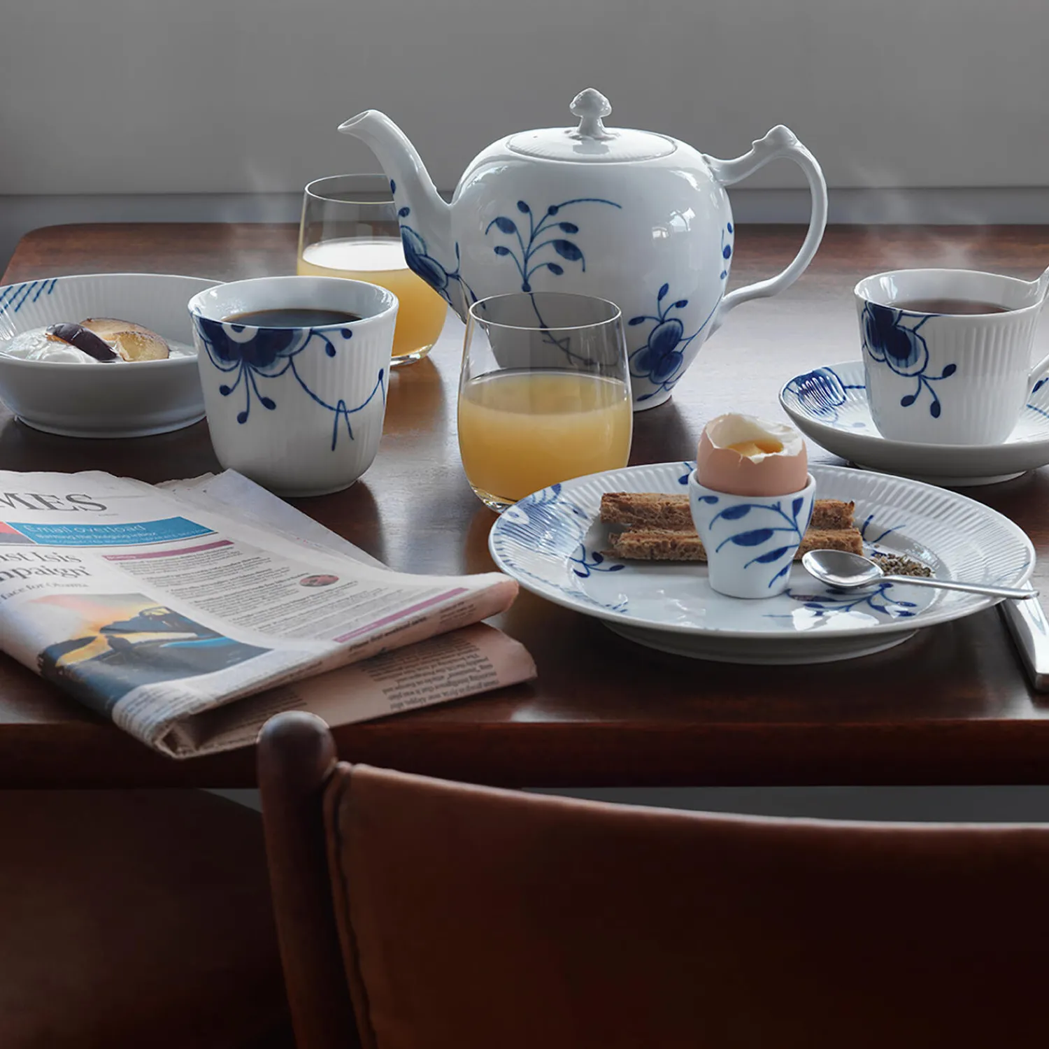 Blå Mega Riflet højhankskop med underkop i porcelæn fra Royal Copenhagen. Højhankskoppen og underkop på 24 cl i Blå Mega Riflet er ideel til enhver varm drik. Det håndmalede mønster af forstørrede elementer skaber et kontemporært udtryk, der giver et spændende modspil til koppens klassiske formgivning.
