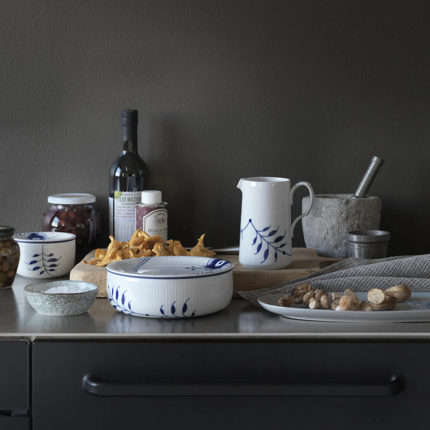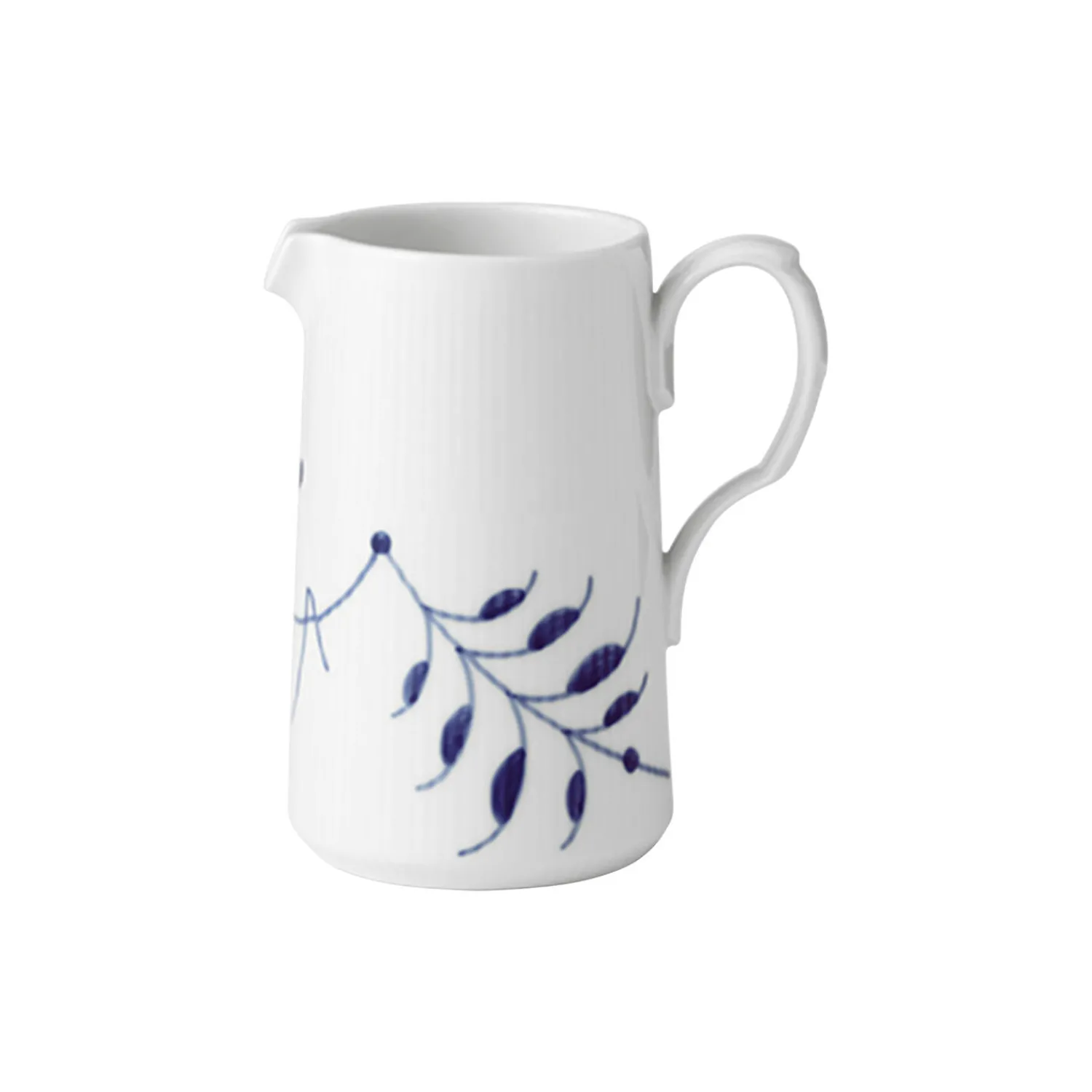 Blå Mega Riflet kande i porcelæn fra Royal Copenhagen. I Blå Mega Riflet forenes den klassiske elegance fra Musselmalet Riflet med nutidens formsprog i ekspressiv funktionalitet. Den nye 50 cl kande i Blå Mega Riflet er perfekt til mælk til kaffen og er et smukt eksempel på stellets smukke forening af fortid og nutid.