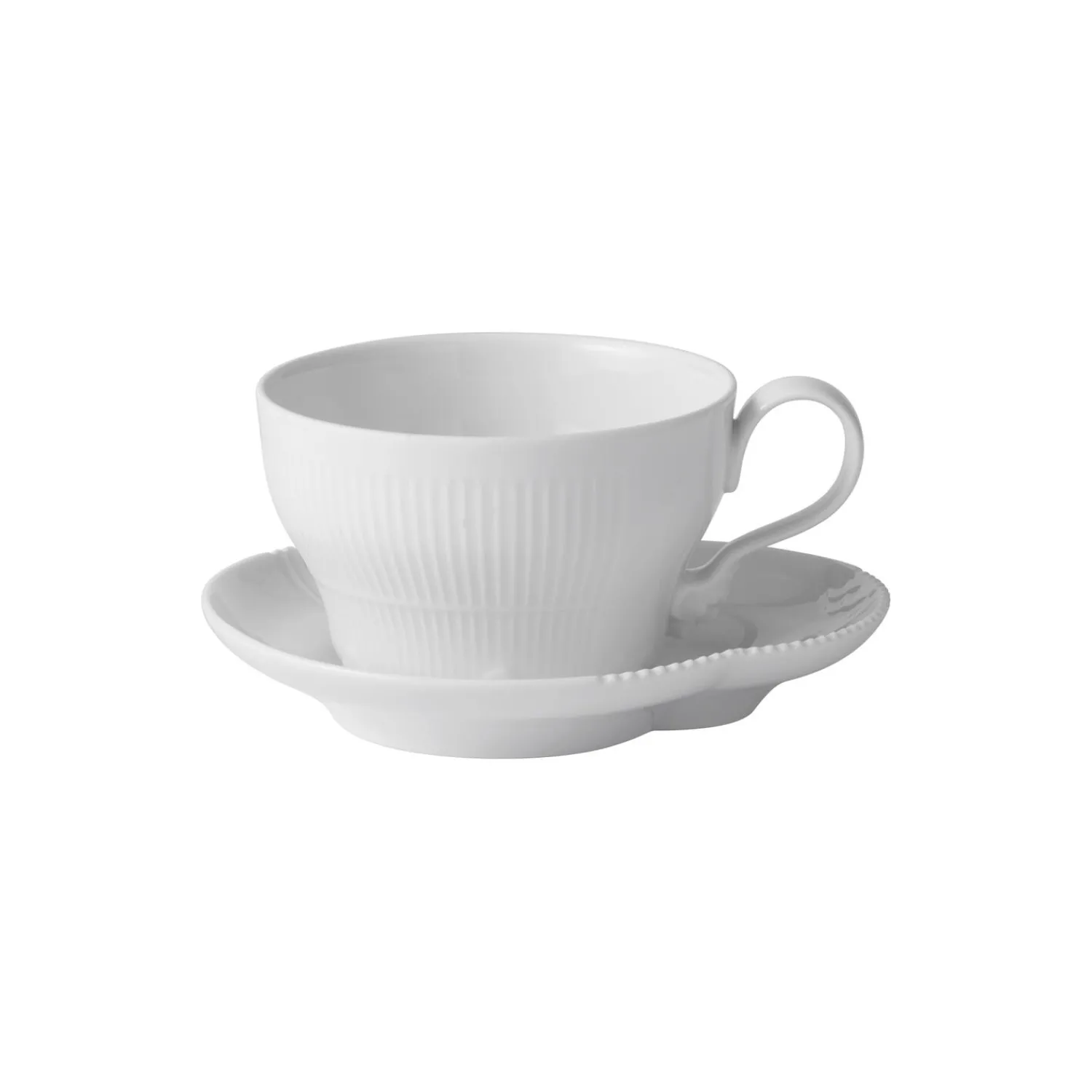 Hvid Elements kop med underkop i porcelæn fra Royal Copenhagen. Med sit organiske formsprog og unikke, håndlavede detaljer er den smukke Hvid Elements 26 cl kop og underkop en helt særlig tilføjelse til din samling af kopper og krus. Underkoppens charmerende form inviterer til at placere en lille småkage eller andet sødt ved siden af din kaffe eller te. Ud over et formsprog ud over det sædvanlige er koppens hank prydet af en ansigtsformet dekoration, en såkaldt grotesk.