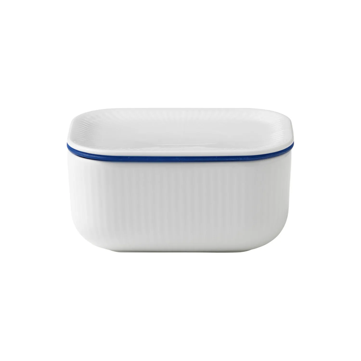 Hvid Riflet smørskål med låg i porcelæn fra Royal Copenhagen. Hvid Riflet Smørkrukken med låg på 42 cl tager sig smukt ud på ethvert bord i sin riflede enkelthed. Porcelænskrukken holder smørret koldt i længere tid, og silikonekanten i låget gør krukken lufttæt og vækker minder om Royal Copenhagens ikoniske, blå mønstre.
