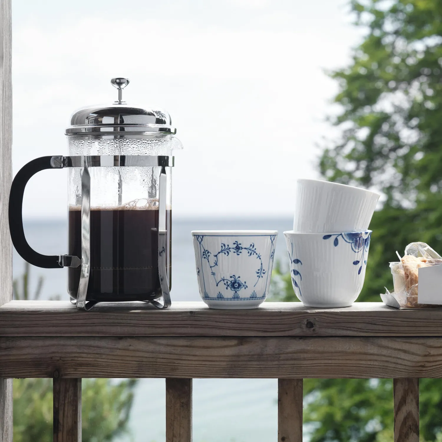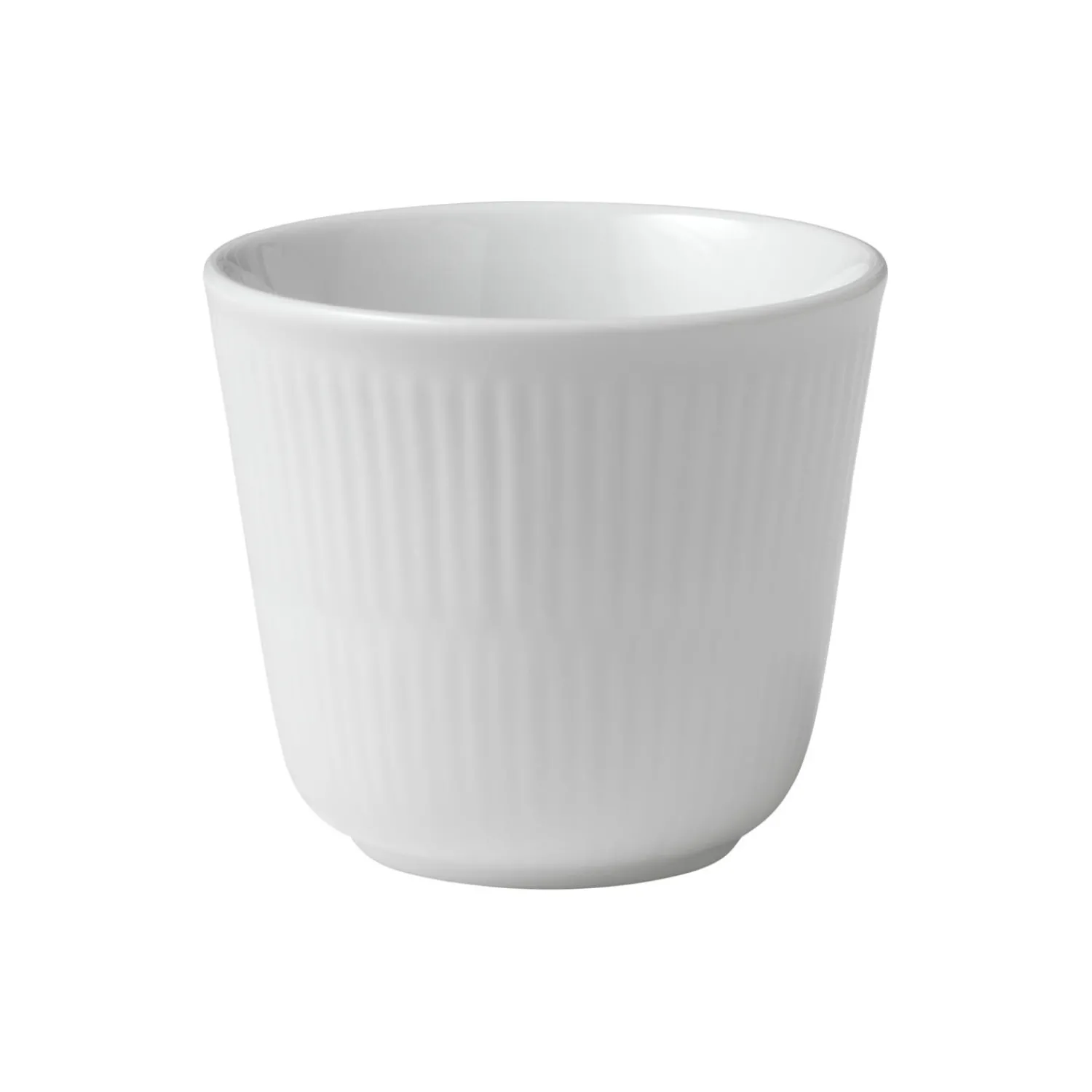Hvid Riflet termokop i porcelæn fra Royal Copenhagen. Den fine, riflede overflade på denne Hvid Riflet Termokop på 26 cl tilfører en særlig taktil oplevelse til enhver kaffestund. Koppens indre og ydre lag former et hulrum, som hindrer koppen i at lede varme til ydersiden. Den lille størrelse er perfekt til mindre kopper af din yndlingste eller -kaffe.