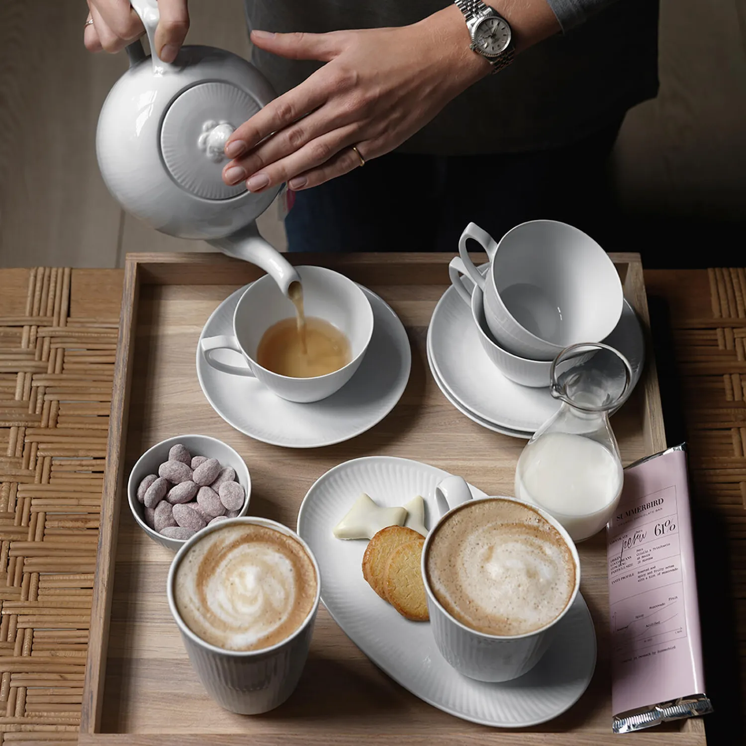 Hvid Riflet termokop i porcelæn fra Royal Copenhagen. Denne store Hvid Riflet Termokop på 39 cl giver plads til skum på toppen af dine varme drikke. Koppens indre og ydre lag former et hulrum, der hindrer koppen i at lede varme til ydersiden. Tilføj koppen til din eksisterende samling af af Hvid Riflet eller kombinér termokoppen med andre kopper og krus fra Royal Copenhagens håndmalede stel for et personligt udtryk.