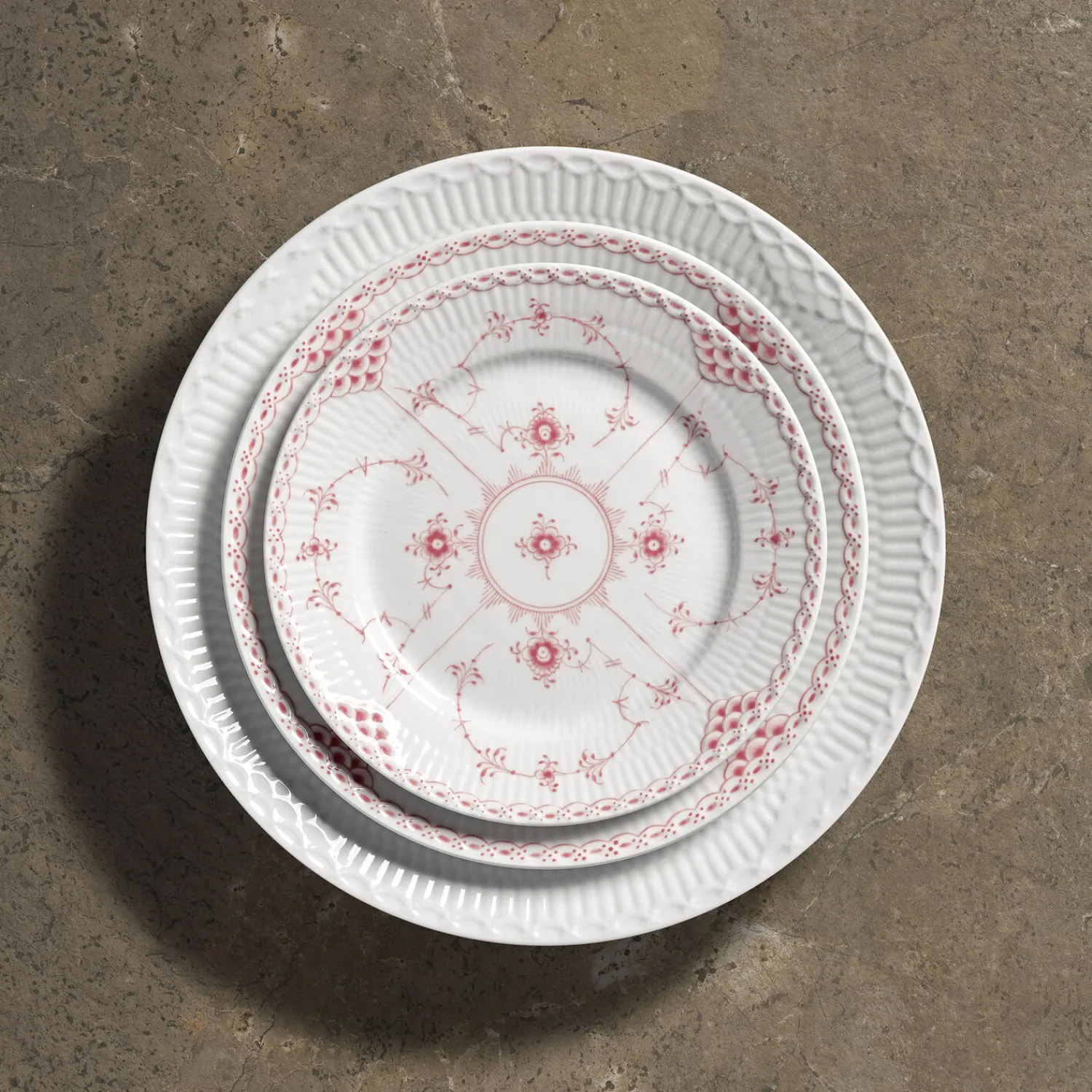 Forestil dig at dække dit kaffe eller frokostbord med denne charmerende Koral Riflet Halvblonde tallerken. Dekoreret i hånden i indglasur teknikken, tilføjer den smukke bløde koralskygge et strejf af romantisk livlighed til den klassiske tallerken. Bland det med de hvide kollektioner fra Royal Copenhagen for at skabe et elegant bord med et let farvedrys.