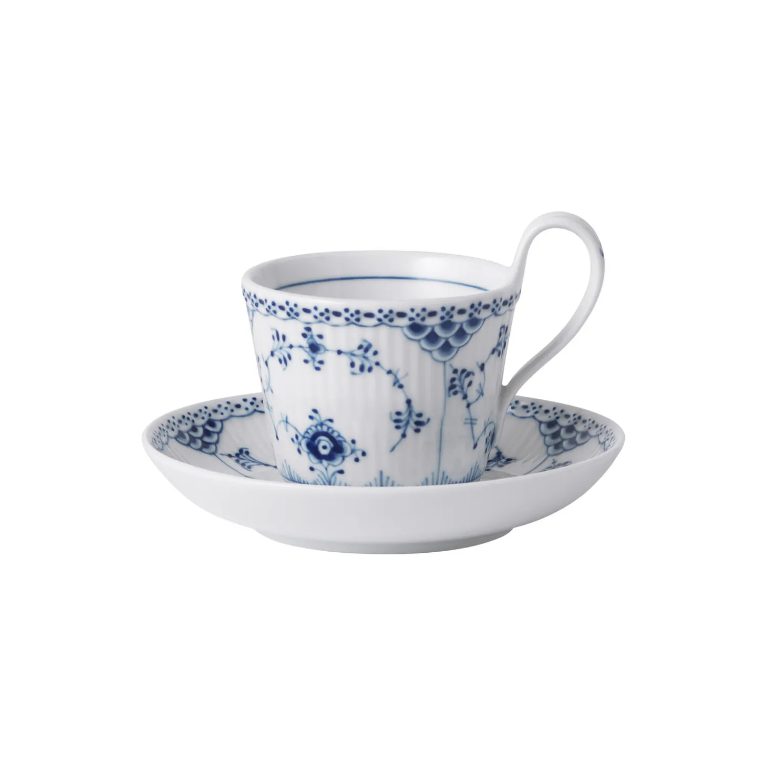 Musselmalet Halvblonde kop med underkop i porcelæn fra Royal Copenhagen. Selvom designet bag Musselmalet Halvblonde 17 cl kop med underkop oprindeligt er fra 1800-tallet, har den håndmalede kop og underkop stadig et nutidigt udtryk, der tilføres klassisk romantik af det håndmalede mønster. Den blomstrende dekoration og delikate blonde danner en smuk ramme om enhver kop kaffe eller te.