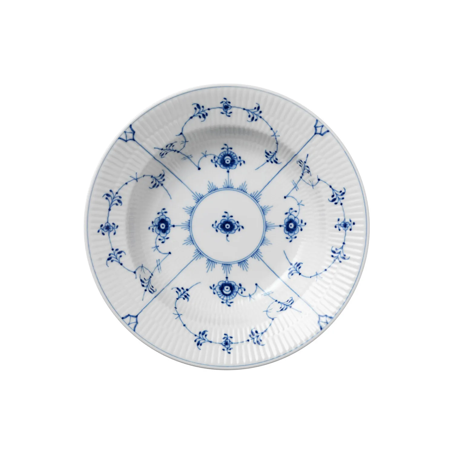 Musselmalet Riflet dyb tallerken i porcelæn fra Royal Copenhagen. Farve: hvid/blå. Mål: Ø 23 cm. Design: Arnold Krog.