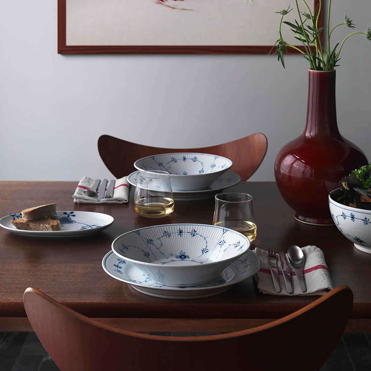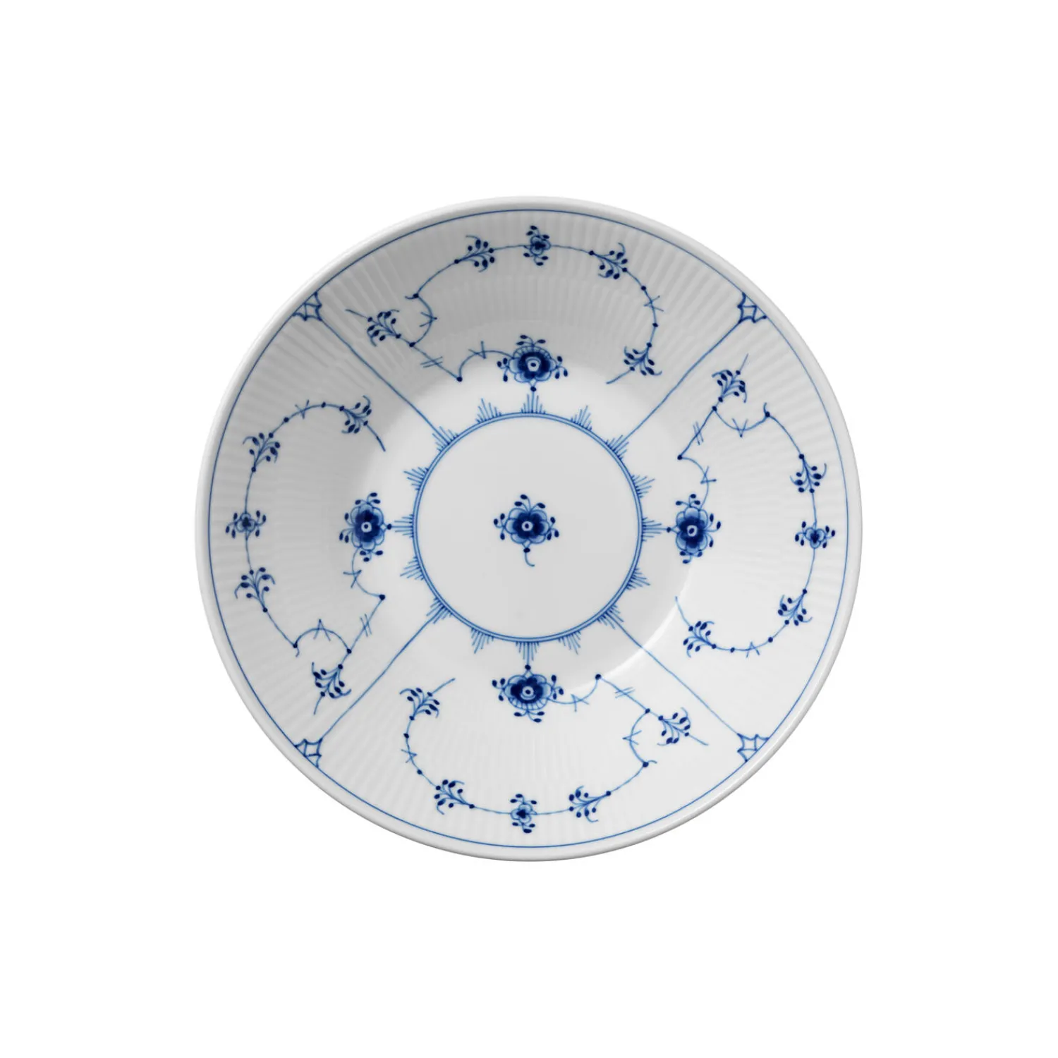 Musselmalet Riflet dyb tallerken i porcelæn fra Royal Copenhagen. En dyb tallerken med en størrelse, som passer til det meste. Det smukke håndmalede mønster af stiliserede palmetter og blomster snor sig om tallerkenens sider, mens blomsten i midten skaber et afbalanceret udtryk.