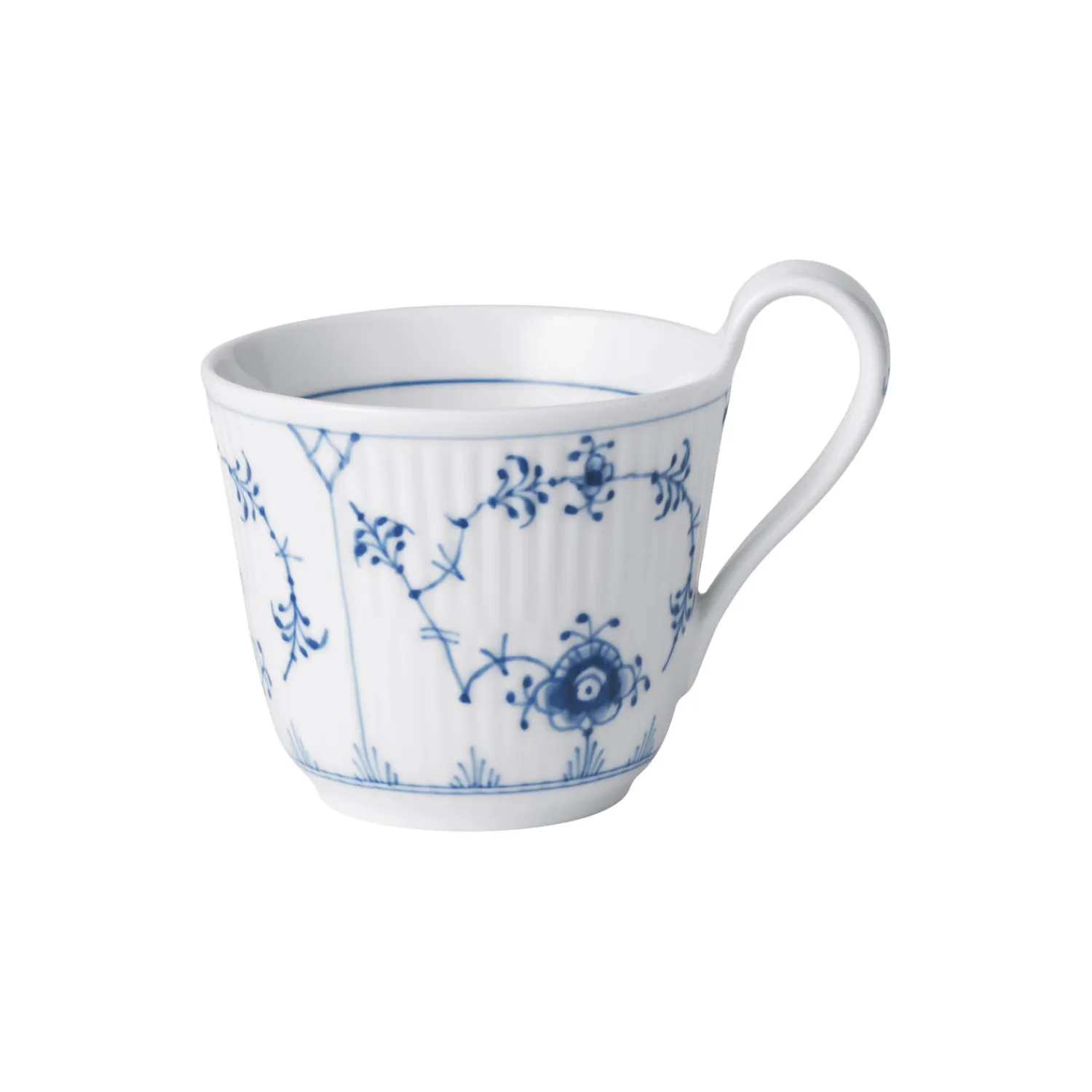 Musselmalet Riflet højhankskop i porcelæn fra Royal Copenhagen. En ny version af et elsket formsprog. Den nye, mindre Musselmalet Riflet højhankskop er den perfekte hverdagsfavorit med det samme, genkendelige mønster som den større højhankskop.