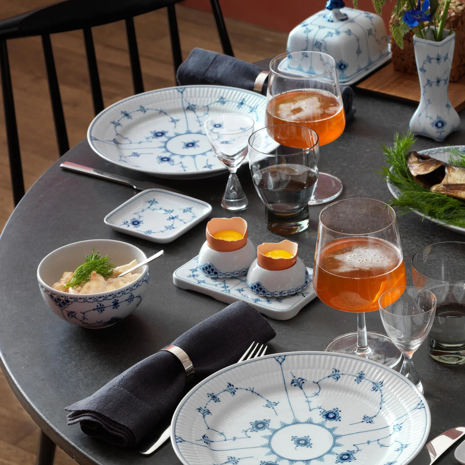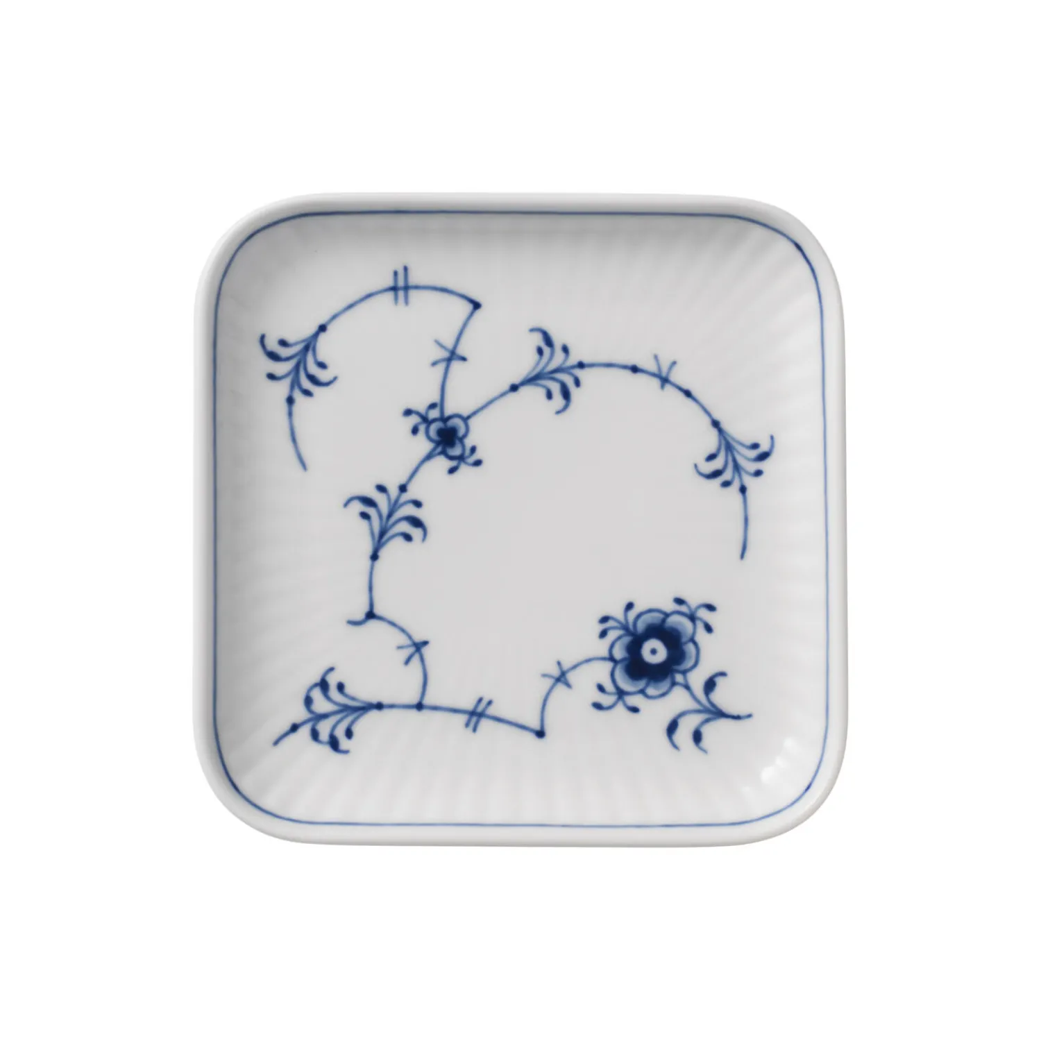 Musselmalet Riflet lille tallerken i porcelæn fra Royal Copenhagen. Blot et enkelt element fra det musselmalede mønster er håndmalet på denne lille, fine tallerken i Musselmalet Riflet. Det enkle udsnit af mønstret komplimenterer størrelsen tallerkenen, som kan bruges som asiet eller til andre små serveringer.
