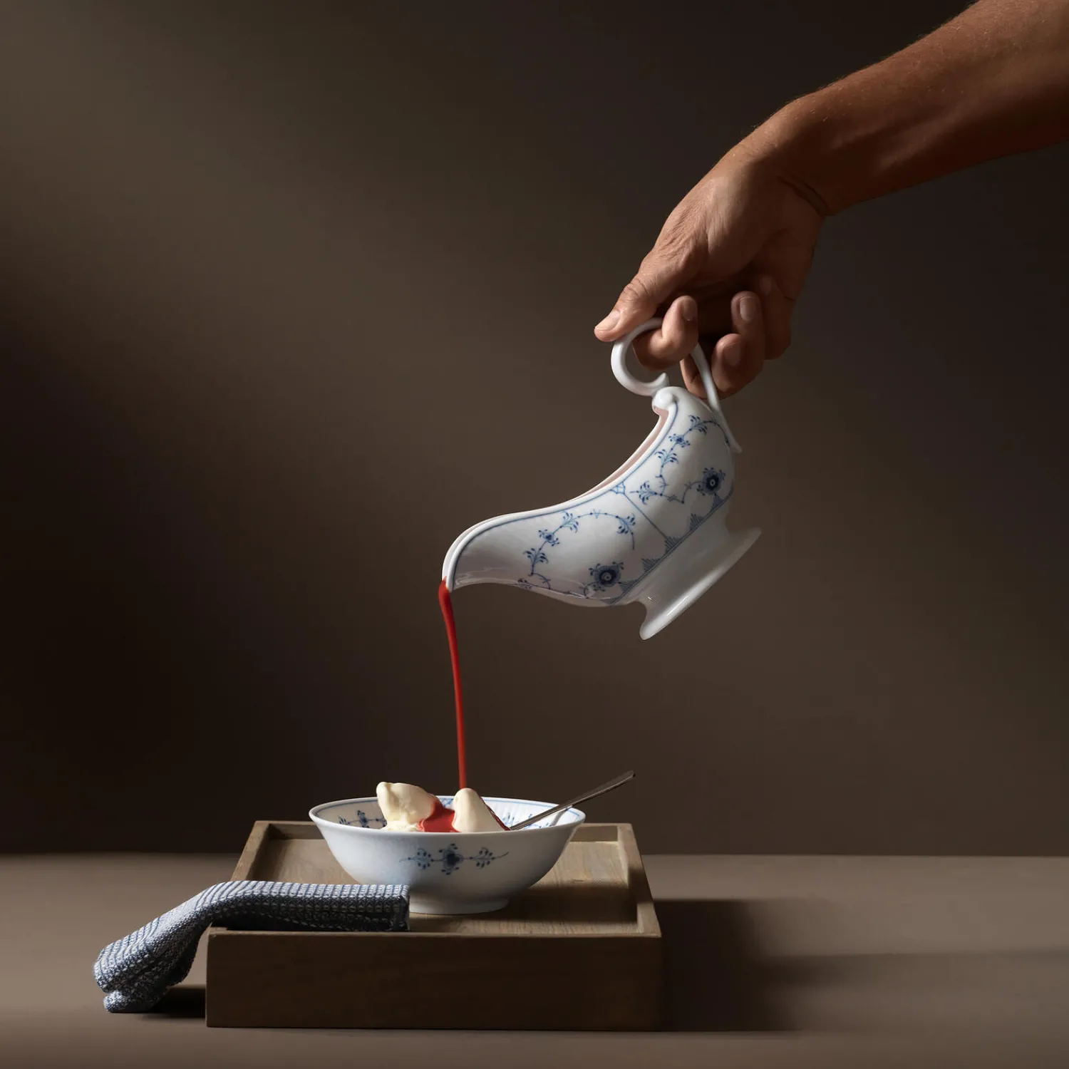 Musselmalet Riflet skål i porcelæn fra Royal Copenhagen. Den lille porcelænsskål er rigt dekoreret med det musselmalede mønster på indersiden, mens ydersiden er holdt i et simpelt udtryk med få penselstrøg. Skålens elegante design passer til enhver lejlighed.