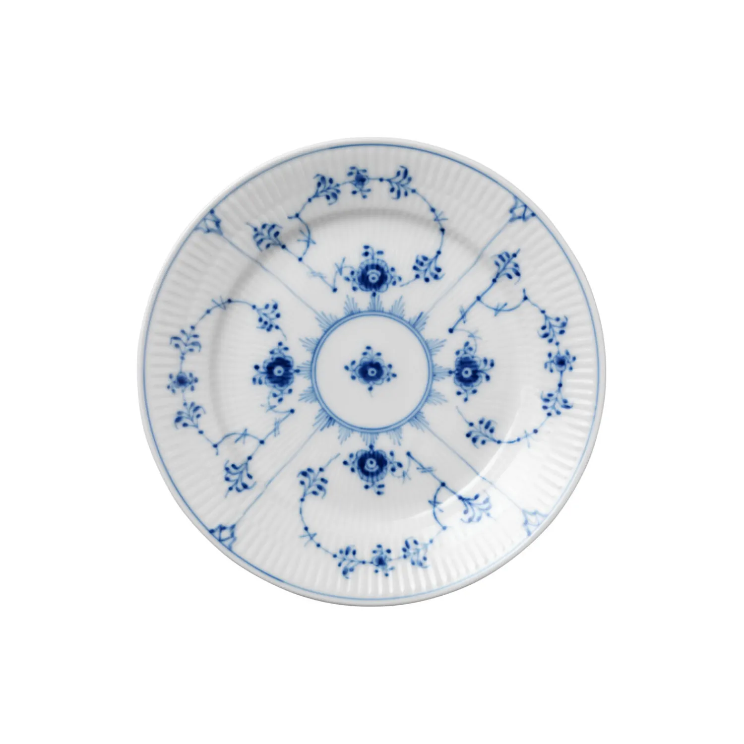 Musselmalet Riflet desserttallerken i porcelæn fra Royal Copenhagen. En mindre tallerken på 19 cm, som er ideel til små retter, frokost eller hvad hjertet begærer. Musselmalet Riflet giver med sin store detaljerigdom en tallerken, som bliver ved med at overraske, hver gang den sættes på bordet.