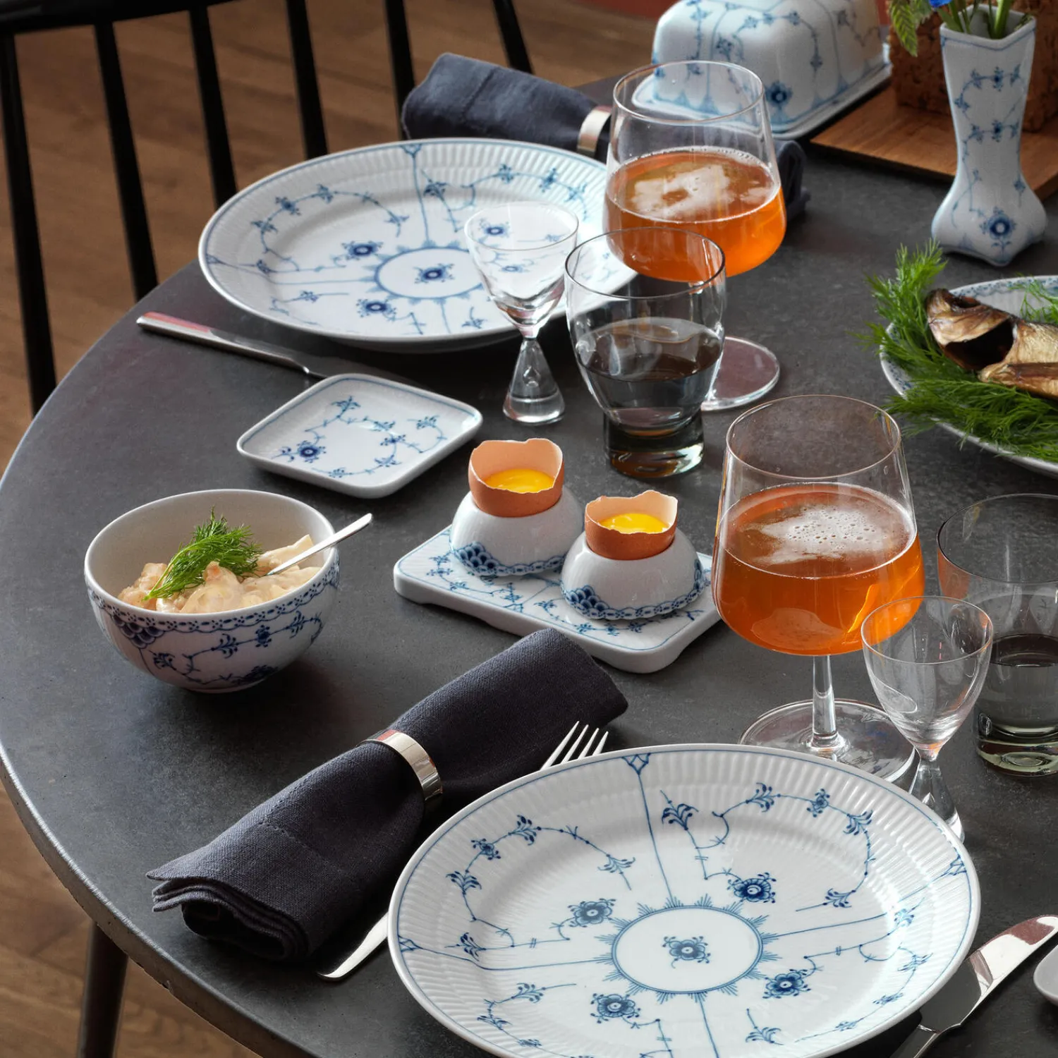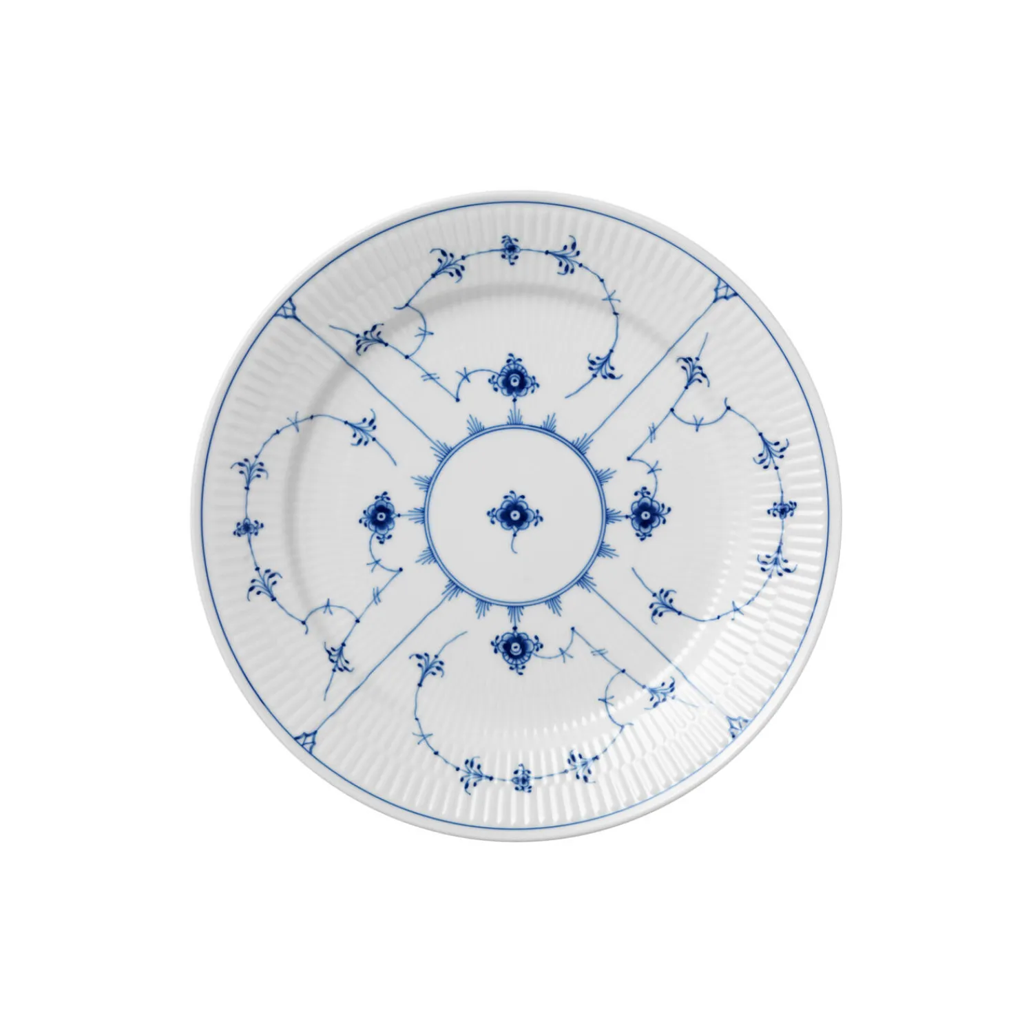 Musselmalet Riflet middagstallerken i porcelæn fra Royal Copenhagen. En stor tallerken på 27 cm, som kan rumme alle dine livretter eller bruges som serveringsfad. Tallerkenens generøse størrelse giver det musselmalede mønster plads til at udfolde sig i fuld flor.
