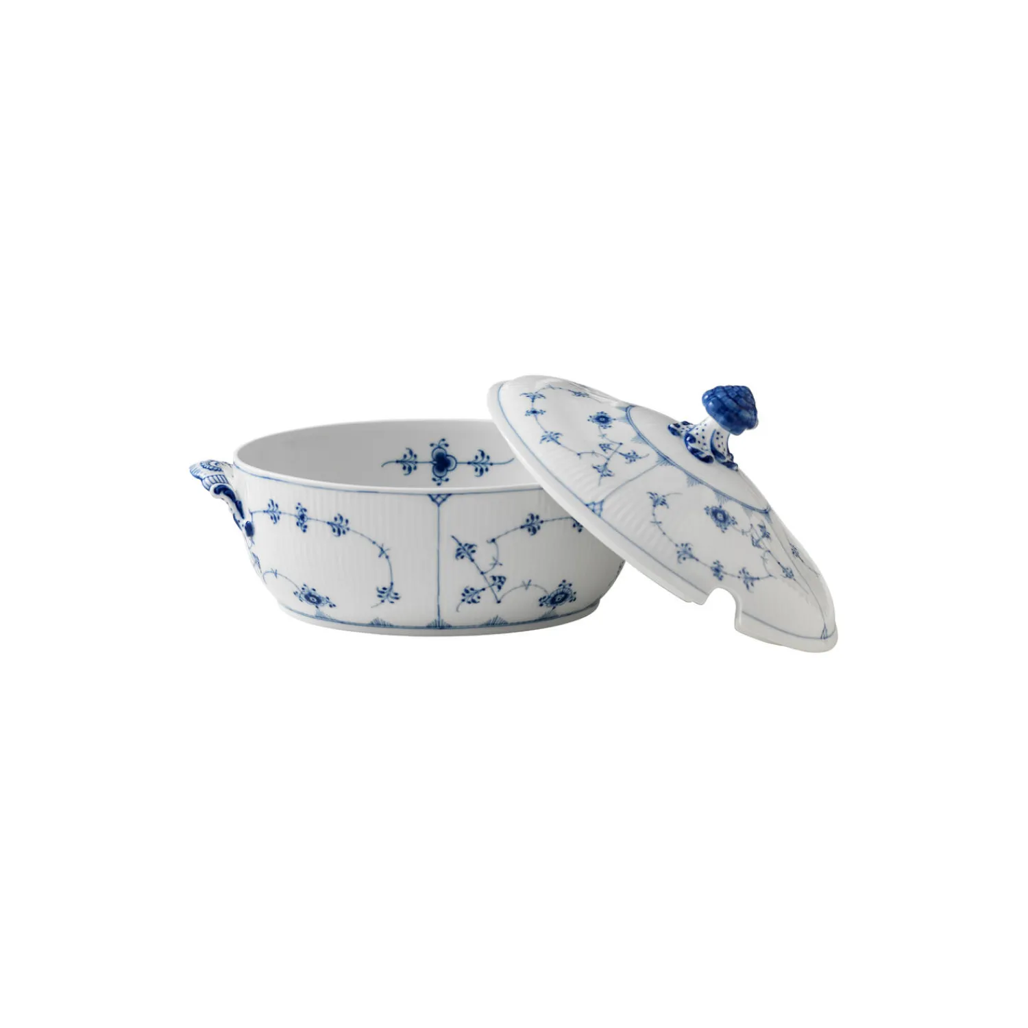 Musselmalet Riflet terrin med låg i porcelæn fra Royal Copenhagen. Den eksklusive terrin i Musselmalet Riflet er et magisk, dekorativt element i ethvert hjem. Suppeterrinen indeholder op til 2 liter, og er smukt dekoreret i det klassiske, blå mønster med særligt fine detaljer på håndtagene.