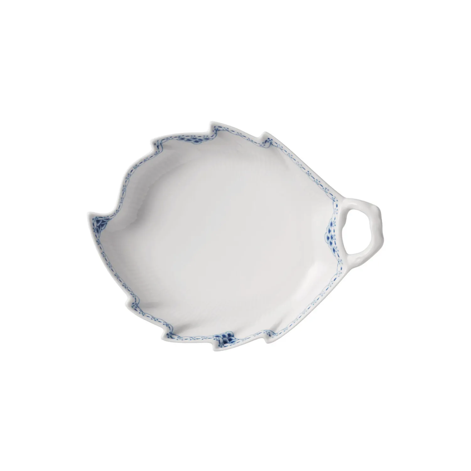 Prinsesse bladformet asiet i porcelæn fra Royal Copenhagen. Med sin håndmalede blondekant langs bladets afrundede spidser og hanken, der er formet som en lille gren, er denne bladformede Prinsesse Asiet på 23 cm et iøjefaldende stykke porcelænshåndværk. Brug fadets romantiske udtryk i en borddækning som sidetallerken eller som et lille serveringsfad på middagsbordet eller kaffebordet.