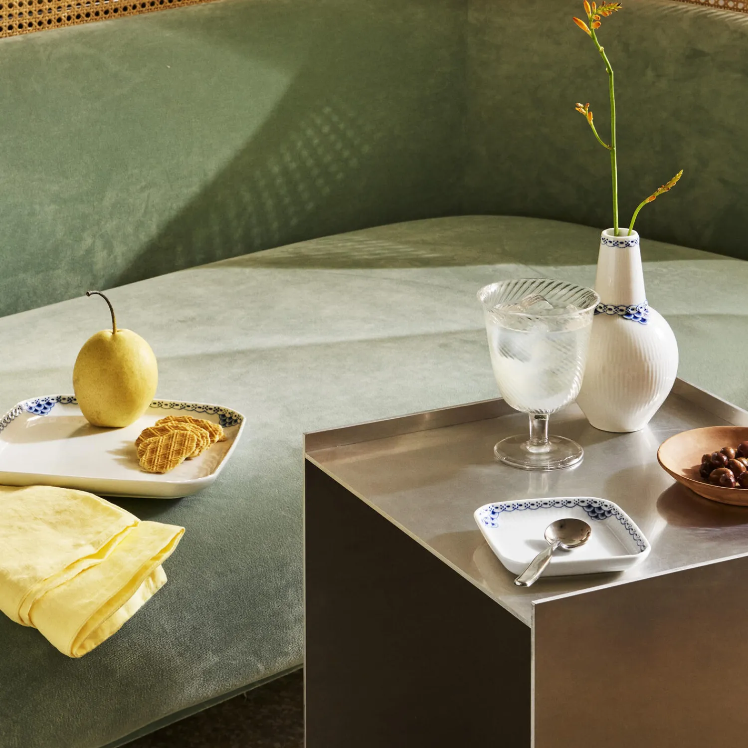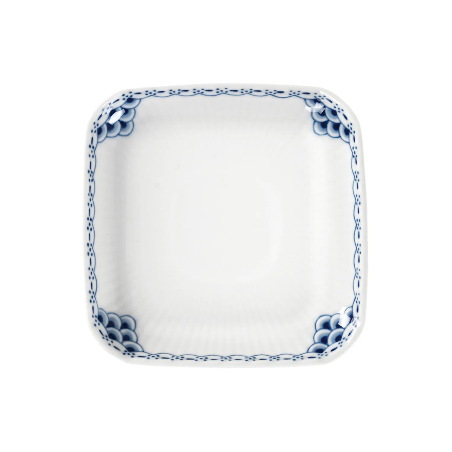 Den lille Prinsesse firkantet tallerken er en charmerende tilføjelse til din porcelænssamling. Et ideelt sted til at opbevare dine smykker om natten eller til små portioner smør til store middagsselskaber. Fadets hjørner er blevet let afrundede for at give plads til de håndmalede blonder.