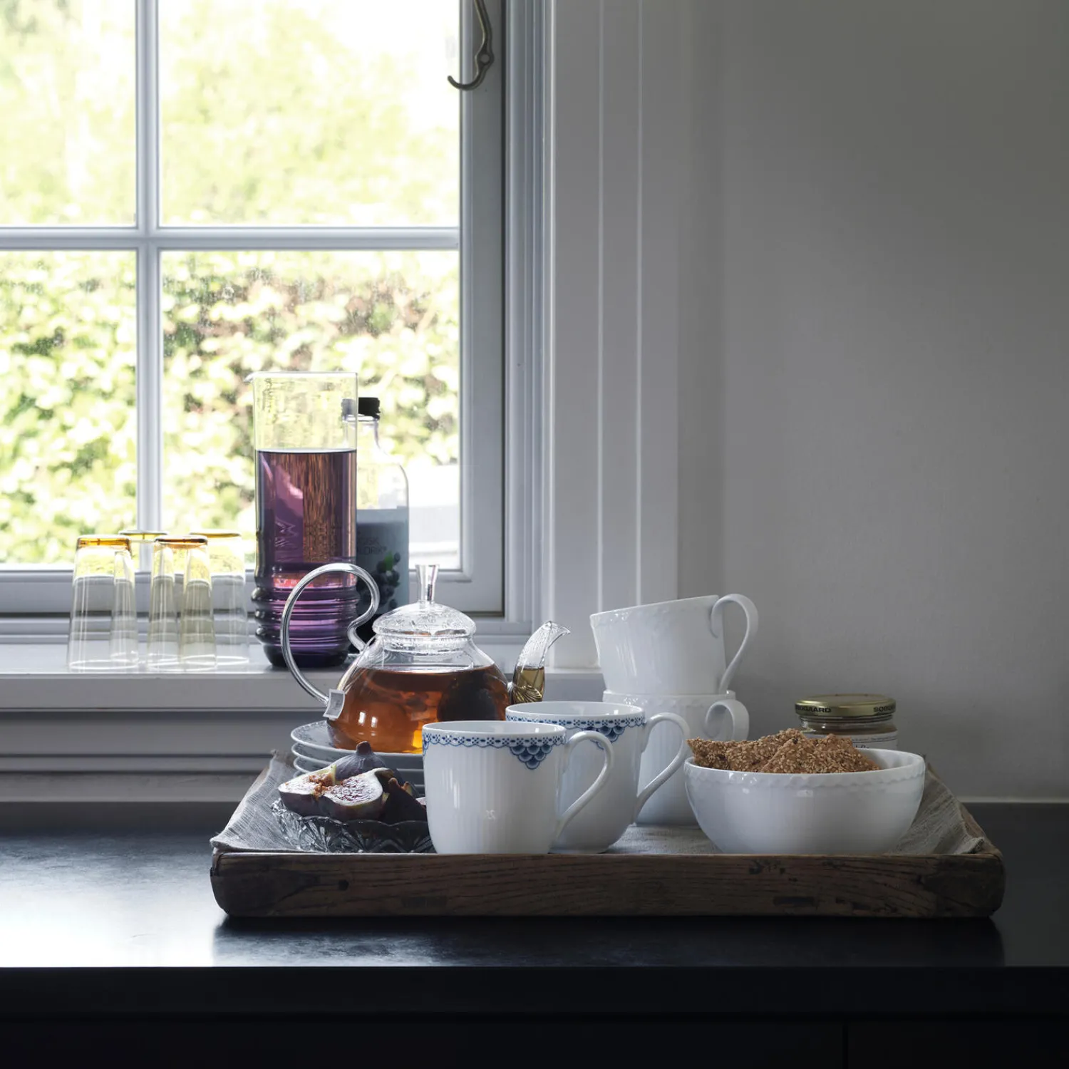 Prinsesse krus i porcelæn fra Royal Copenhagen. De to 37 cl Krus tilfører Prinsesse-stellet et nutidigt formsprog og er skabt til at blive tidløse favoritter i enhver samling af Royal Copenhagen. Krusenes håndmalede blonder tilfører porcelænet et romantisk udtryk, der komplimenterer den organiske udformning og indbyder til nære stunder for to.