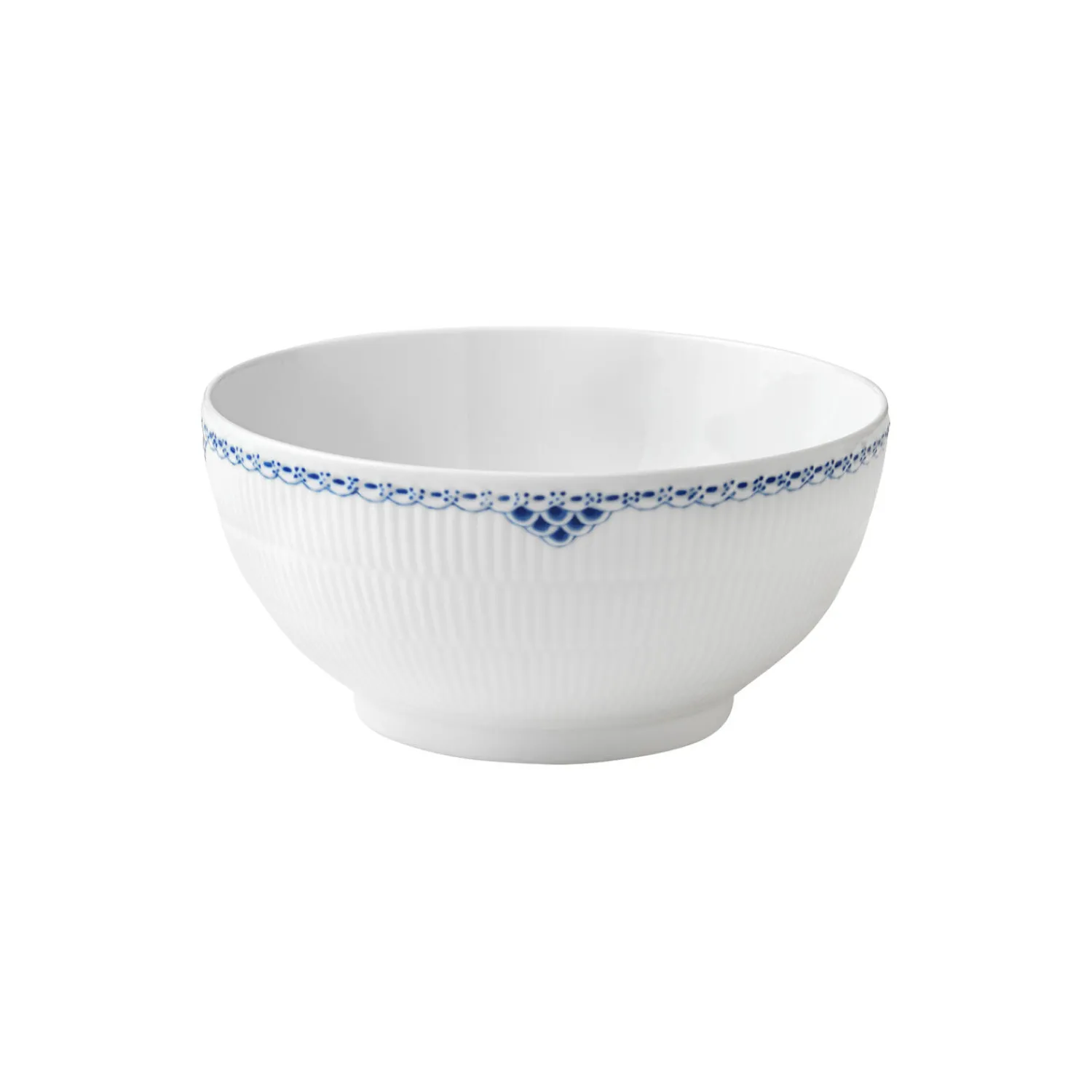 Prinsesse skål i porcelæn fra Royal Copenhagen. Denne store Prinsesse Skål på 310 cl er ideel som en serveringsskål eller en smuk frugtskål. På ydersiden er skålen dekoreret med håndlavede, taktile rifler og den karakteristiske, blåmalede blondekant, der skaber feminint og evigt tidløst udtryk.