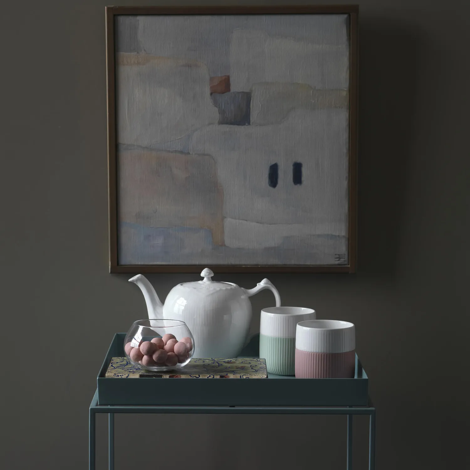 Riflet Contrast krus i porcelæn fra Royal Copenhagen. Riflet Contrast er først og fremmest en pirring af sanserne: Et livligt, sprudlende farvespil og en spændende taktil overgang fra blanke rifler i porcelænet til bløde, eftergivende rifler i silikonen. I Riflet Contrast mødes en klassisk fortid og en foranderlig nutid, hvor hvert år bringer nye farver til kollektionen. Dette forår er farven mos. Afdæmpet og luksuriøs.