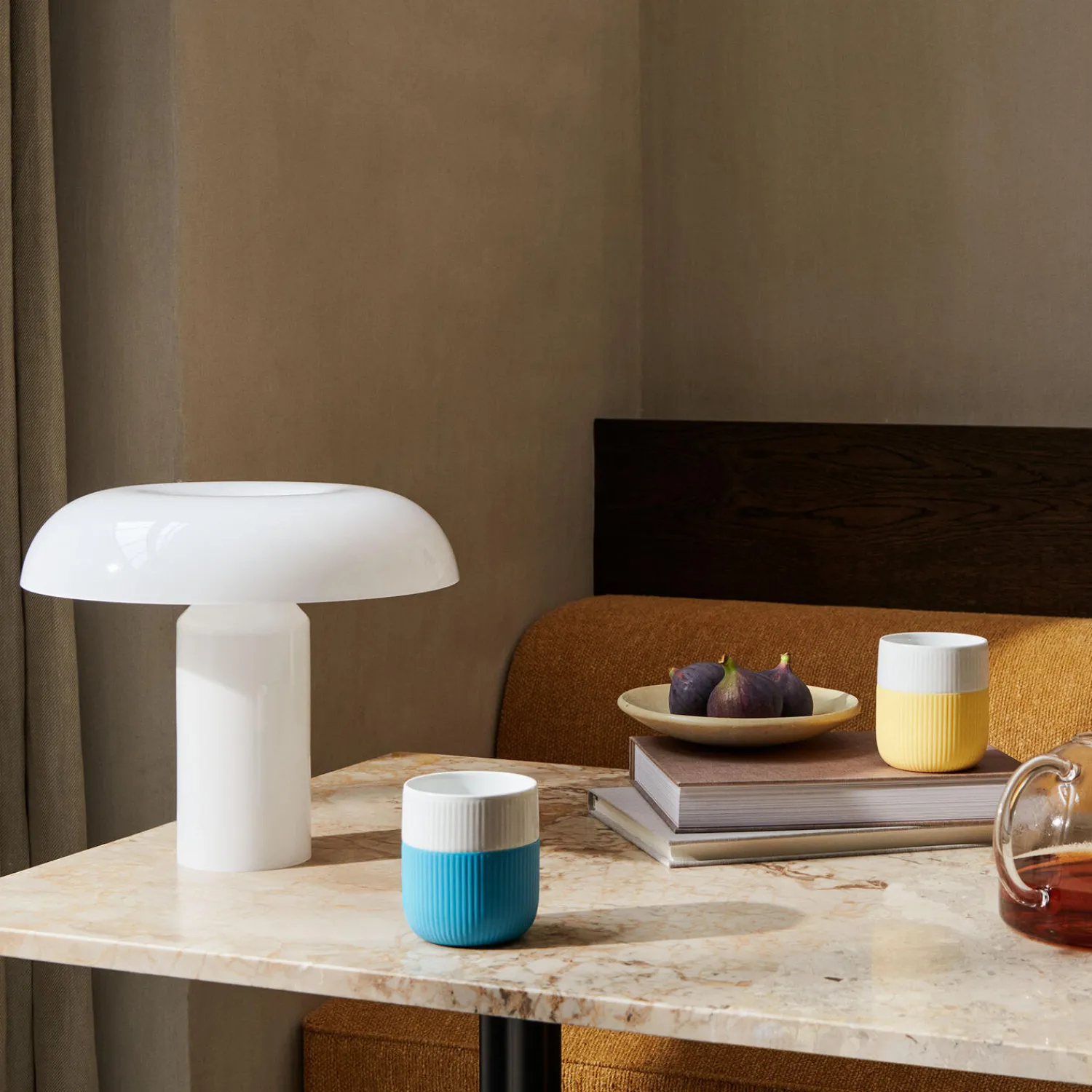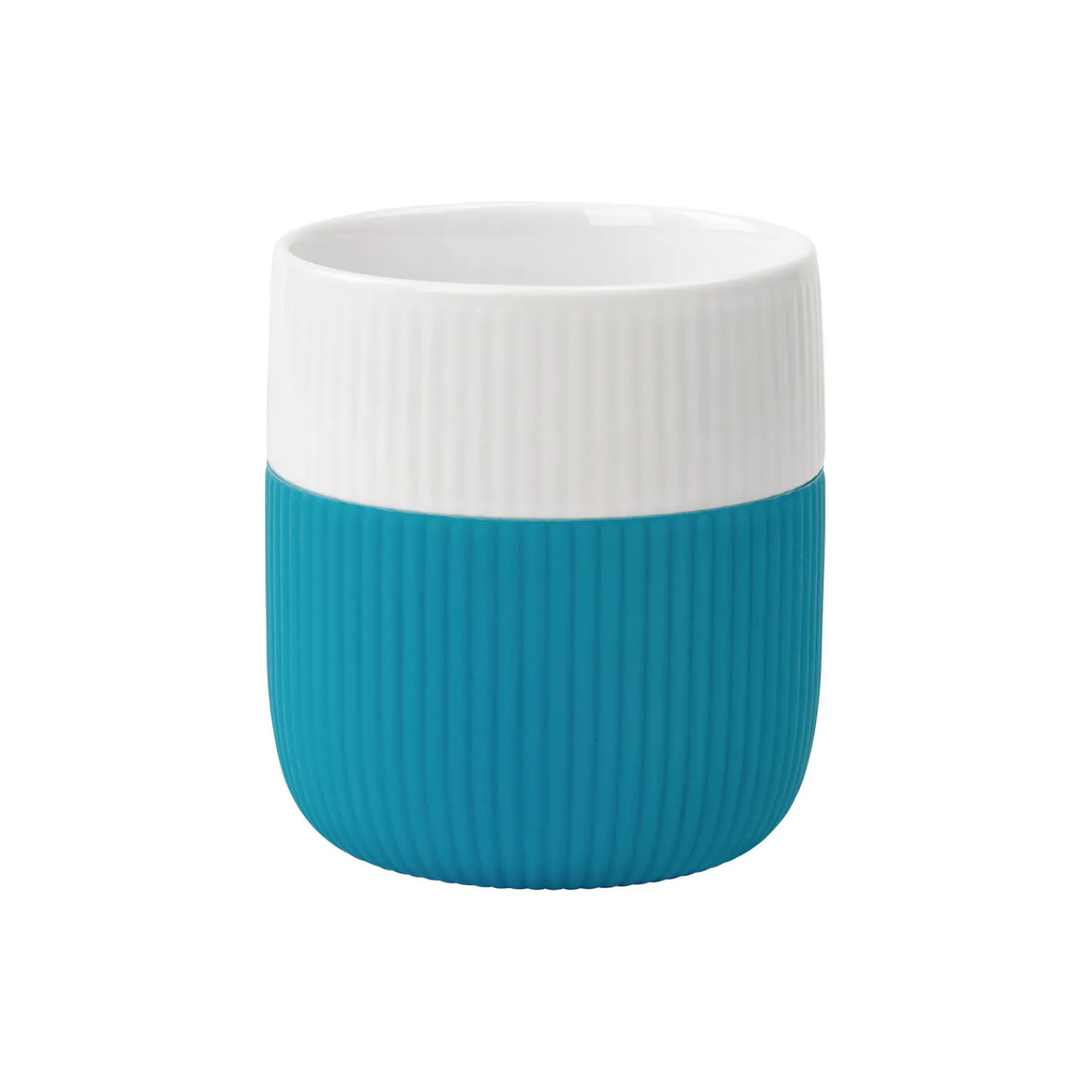 Riflet Contrast krus i porcelæn fra Royal Copenhagen. Intet siger forår som de første varme solstråler og en klar blå himmel. Passende nok kaldes denne kølige farve til de riflede kontrast krus Sol. Farven der minder om de tidlige forårsdage, levende farverig.
