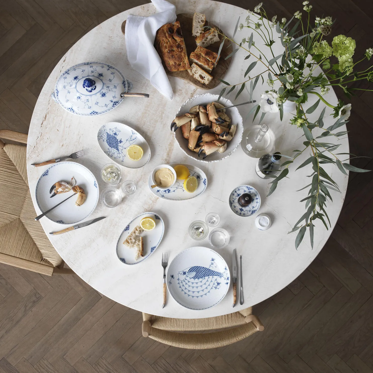 Royal Creatures oval tallerken med krabbe i porcelæn fra Royal Copenhagen.En krabbe bevæger sig elegant over overfladen på den håndmalede, ovale porcelænstallerken, som har fået sit formsprog fra Royal Copenhagens klassiske blondestel. Tallerkenen kan enten bruges til individuelle anretninger eller sammen med steldele fra andre kollektioner for et personligt udtryk.