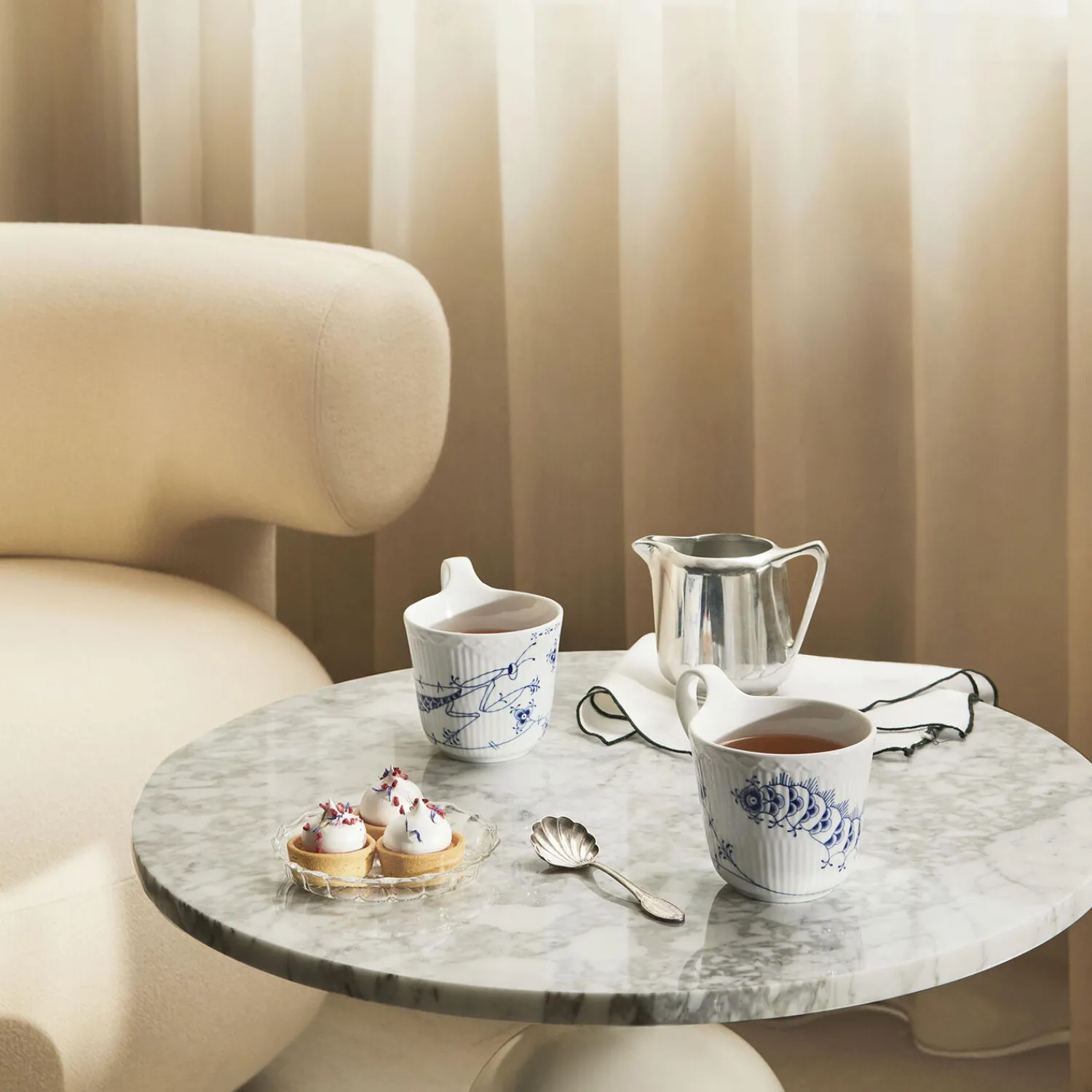 Hvert steldel fra Royal Creatures er dekoreret med en håndmalet skabning fra nær, i eller over havet. På den klassiske højhankskop får en charmerende knæler liv med håndmalet inspiration fra Royal Copenhagens klassiske blondedekorerede stel. Royal Creatures er en kollektion af charmerende steldele designet af GamFratesi.