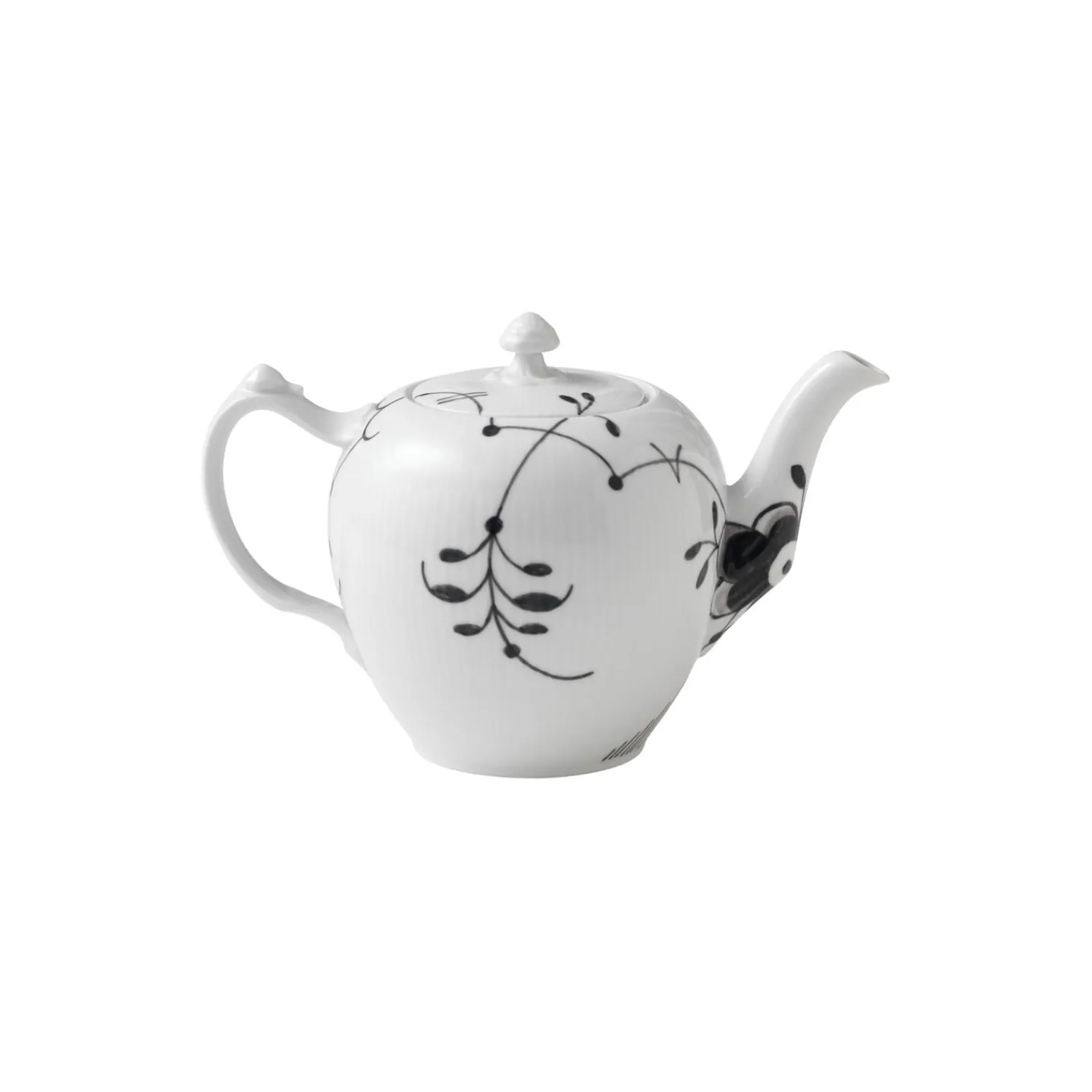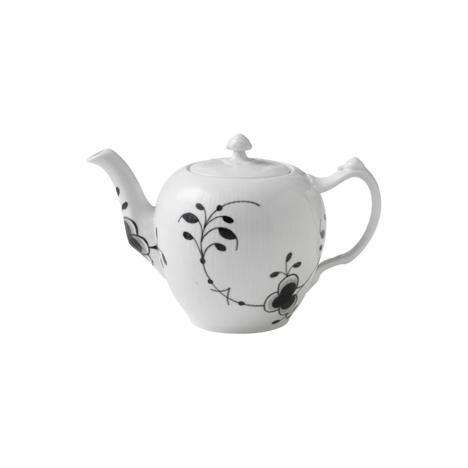 Sort Mega Riflet tekande i porcelæn fra Royal Copenhagen. Palmetter snor sig omkring en nøddeblomst og en krysantemum, der spreder sine kronblade på den elegante tud på denne Sort Mega Riflet Tekande på 100 cl. Med sit håndmalede, monokrome mønster og dramatiske udtryk er porcelænskanden er et nutidigt bud på den traditionelle tekande.