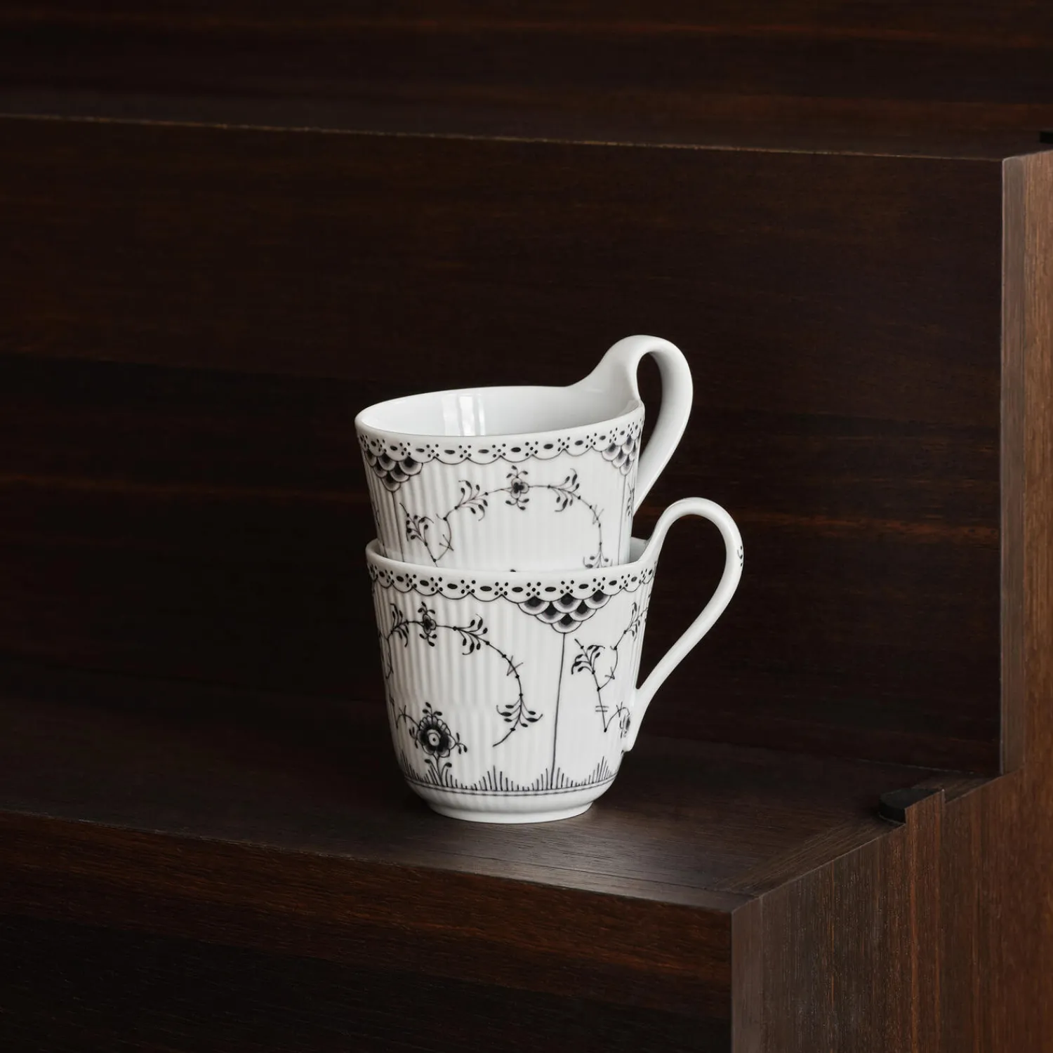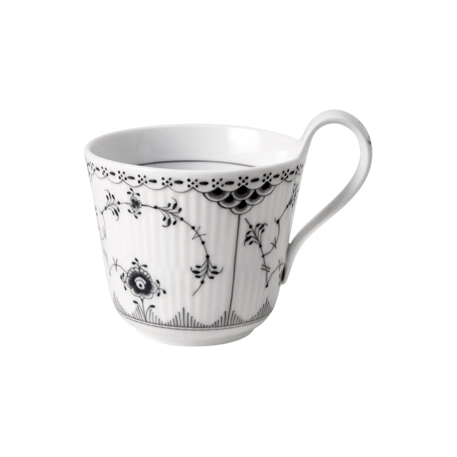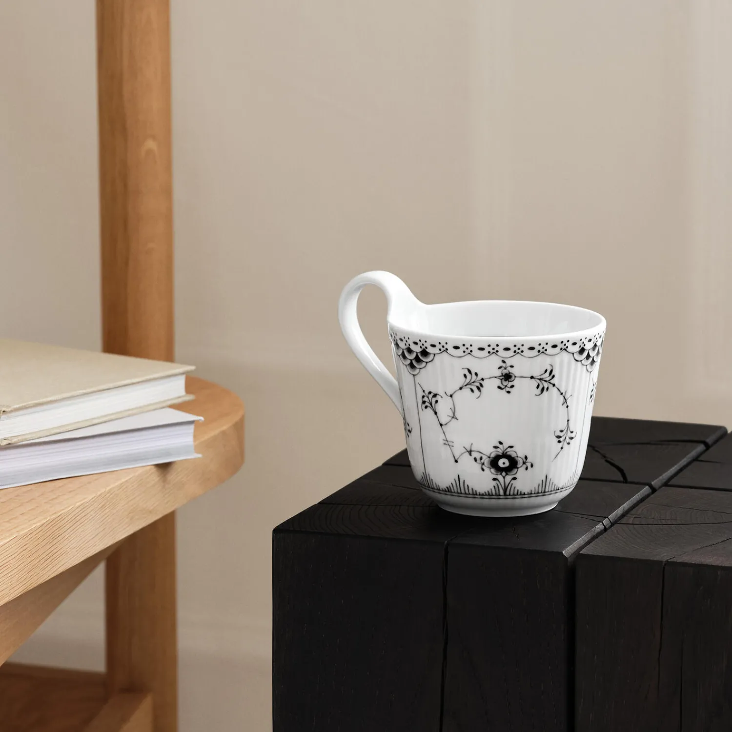 Et sandt ikon for Royal Copenhagen. Sort Musselmalet Halvblonde højhankskop er det perfekte krus til din yndlings kaffe. Lige så smuk i en farverig samling af kopper fra Royal Copenhagen eller når den opbevares i et monokromt univers af sort og hvid.