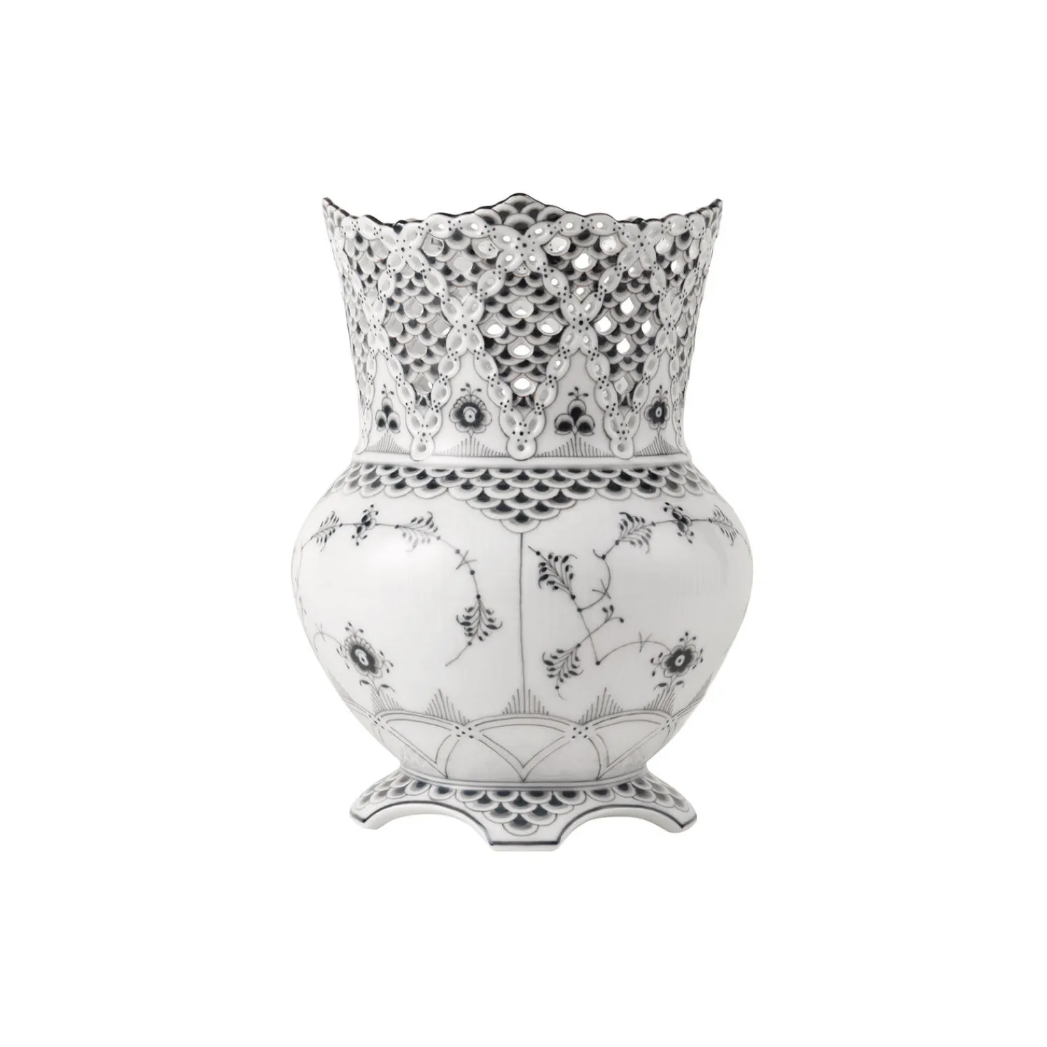 Den større af to Sort Musselmalet Helblonde vaser illustrerer det fineste inden for porcelænshåndværket i både den høje detaljegrad i modelleringen og bemalingen med den svære, sorte farve. Vasen danner smukt centrum på middagsbordet og er en oplagt gaveide til en helt særlig person.