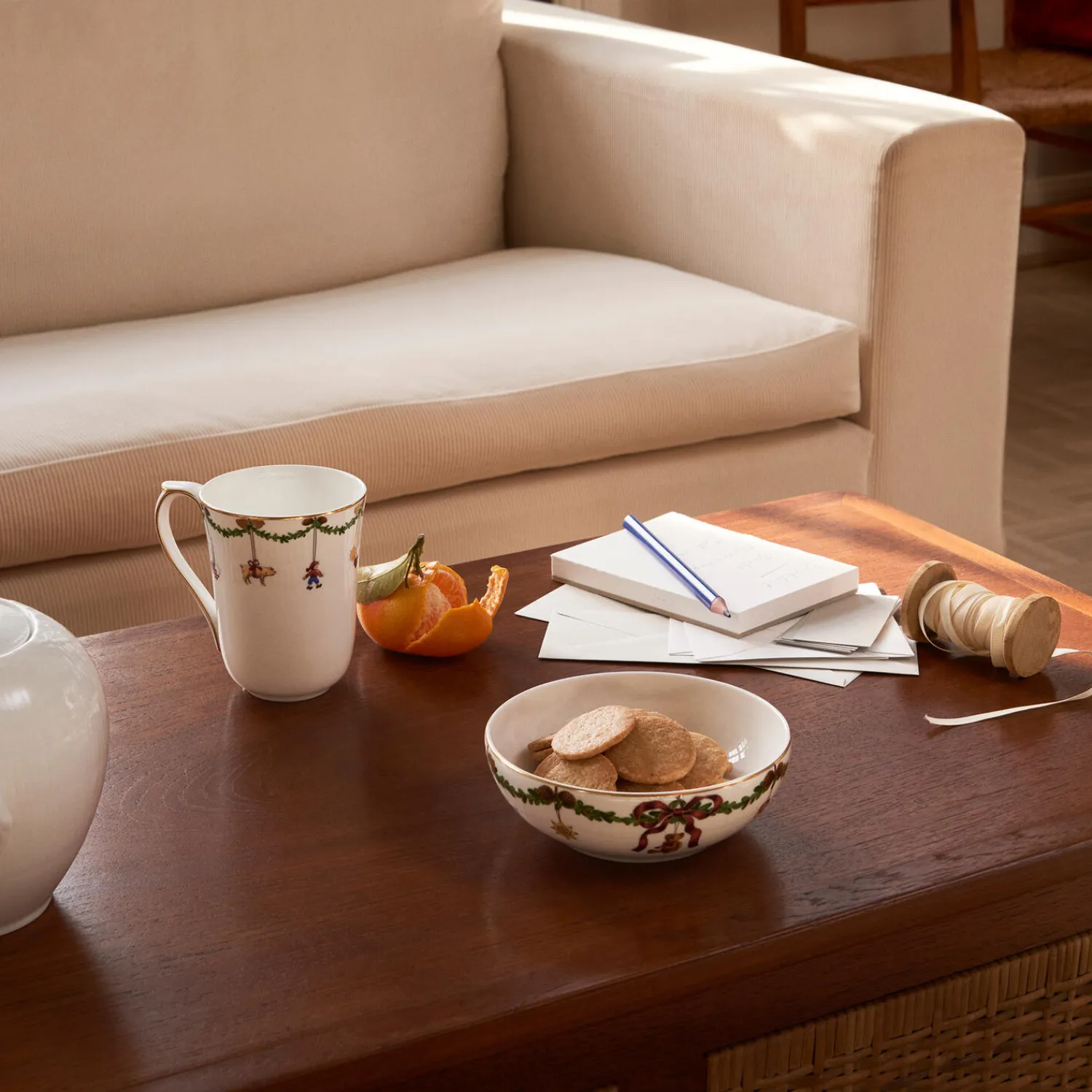 Stjerne Riflet Jul skål i benporcelæn fra Royal Copenhagen. Denne Stjerne Riflet Jul skål på 50 cl er en kærkommen favorit til søde sager, nødder eller desserter, når det skal være lidt ekstra hyggeligt. Skålen er dekoreret med et udvalg af julepynt så som en bamse og julesmåkage.