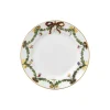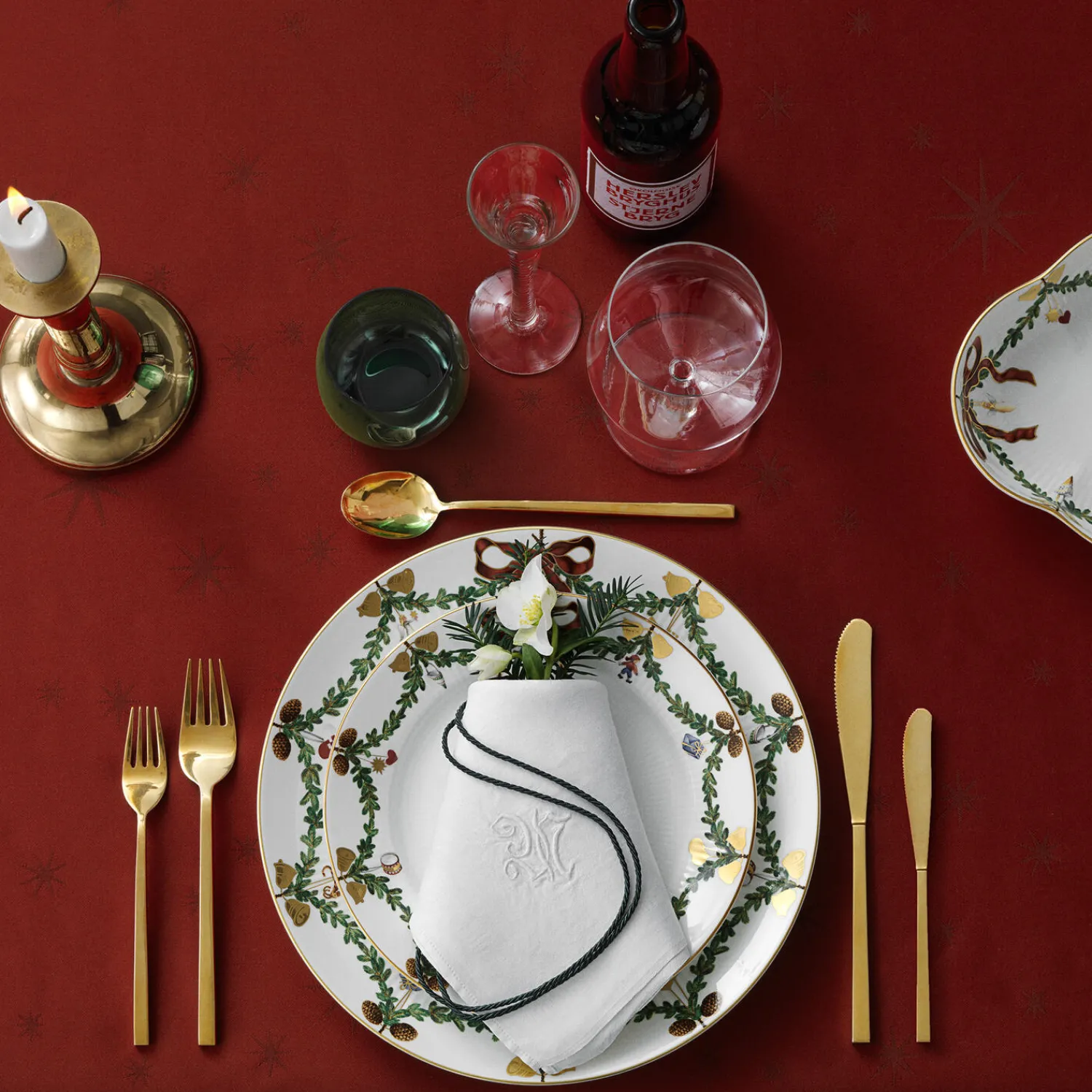 Stjerne Riflet Jul tallerken i benporcelæn fra Royal Copenhagen. Denne smukke tallerken fra Stjerne Riflet Jul-stellet er dekoreret med en klassisk granguirlande, som hænger fra guldkanten og er udsmykket med fine juleornamenter. Tallerkenen på 19 cm er ideel som frokosttallerken og desserttallerken og kan med fordel sættes sammen med andre steldele fra Royal Copenhagen for et personligt udtryk.