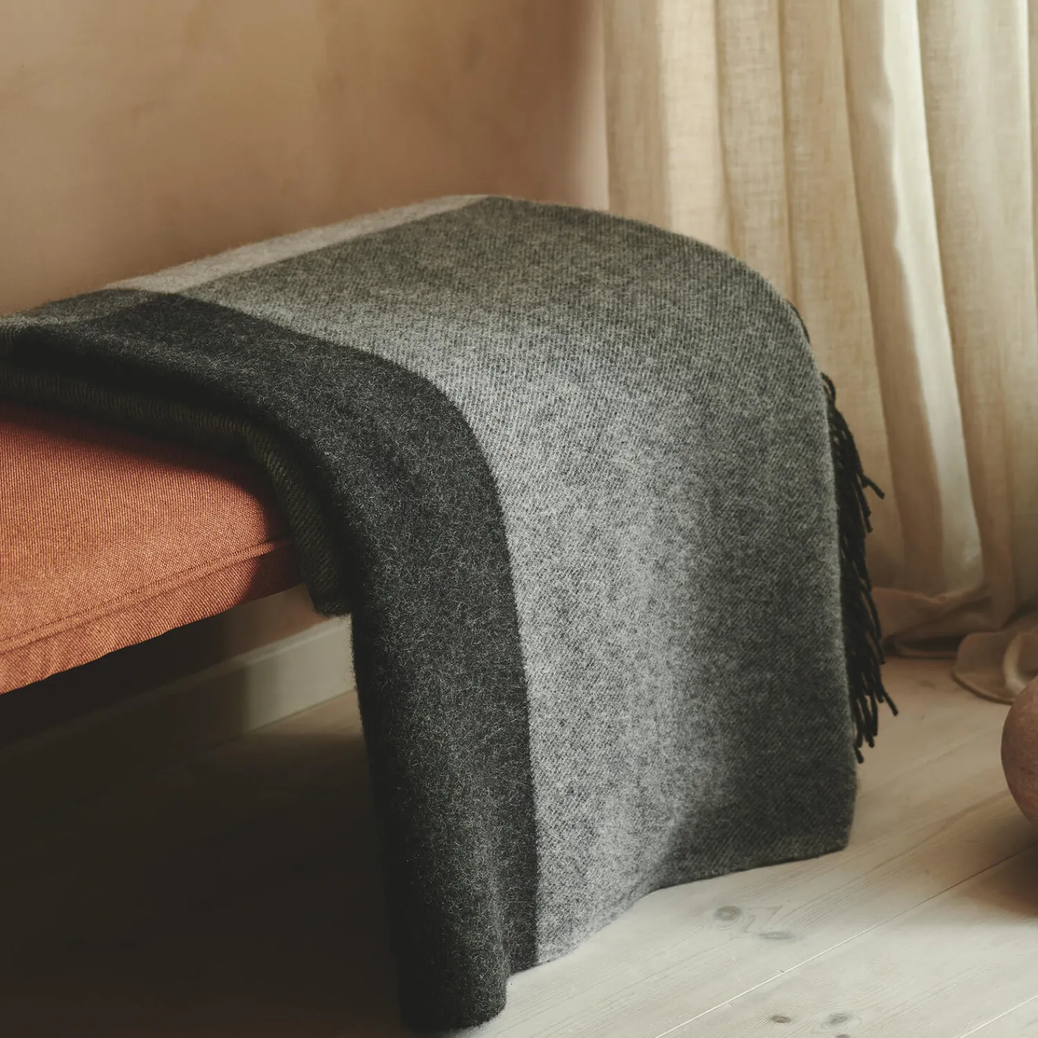 Drejø er vævet i 100% skandinavisk uld. et stramt udtryk med et grafisk præg. Afhængig af måden du folder plaiden på, er det muligt at skabe forskellige atmosfærer og udtryk.