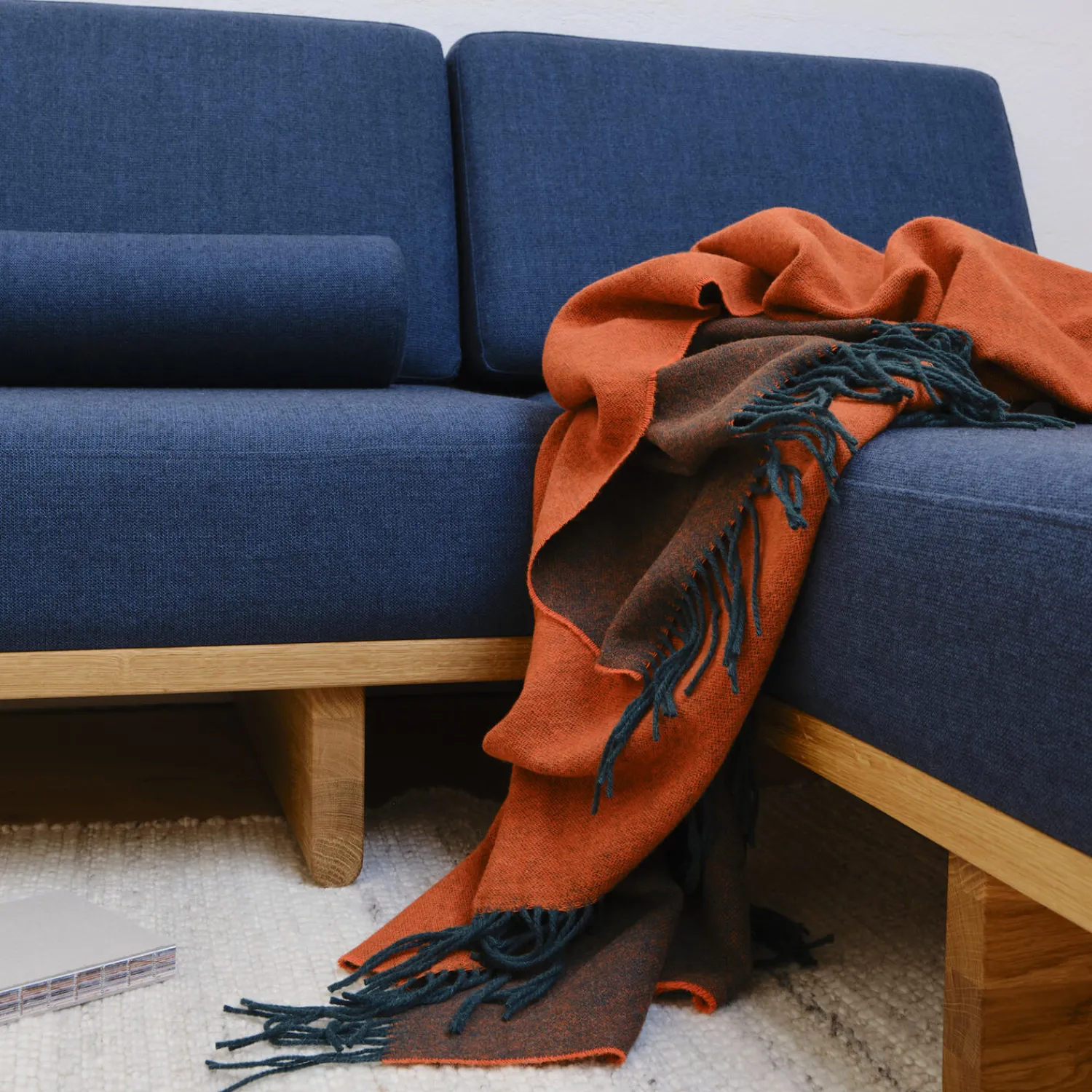 Franja er vævet i 50% alpaka og 50% uld. ‘Franjas’ smukke farver, ‘Butter Peach’ og ‘Burgundy Blue’, tilføjer plaiderne et smukt udtryk til hjemmets mange hyggelige kroge.