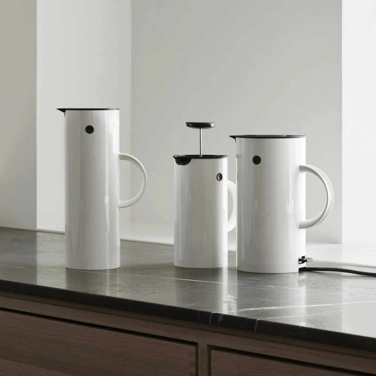 Erik Magnussens klassiske termokande EM77 har prydet kaffeborde verden rundt i over 40 år, og nu introduceres et helt nyt medlem af EM familien: EM77 elkedlen, der tilfører køkkenet et stilrent udtryk og funktionelt komplementerer EM77 stempelkanden. EM77 elkedlen på 1,5 l. koger vandet koger hurtigt på et minimum af energi. Kedlen er ledningsfri og kan tages med på bordet.