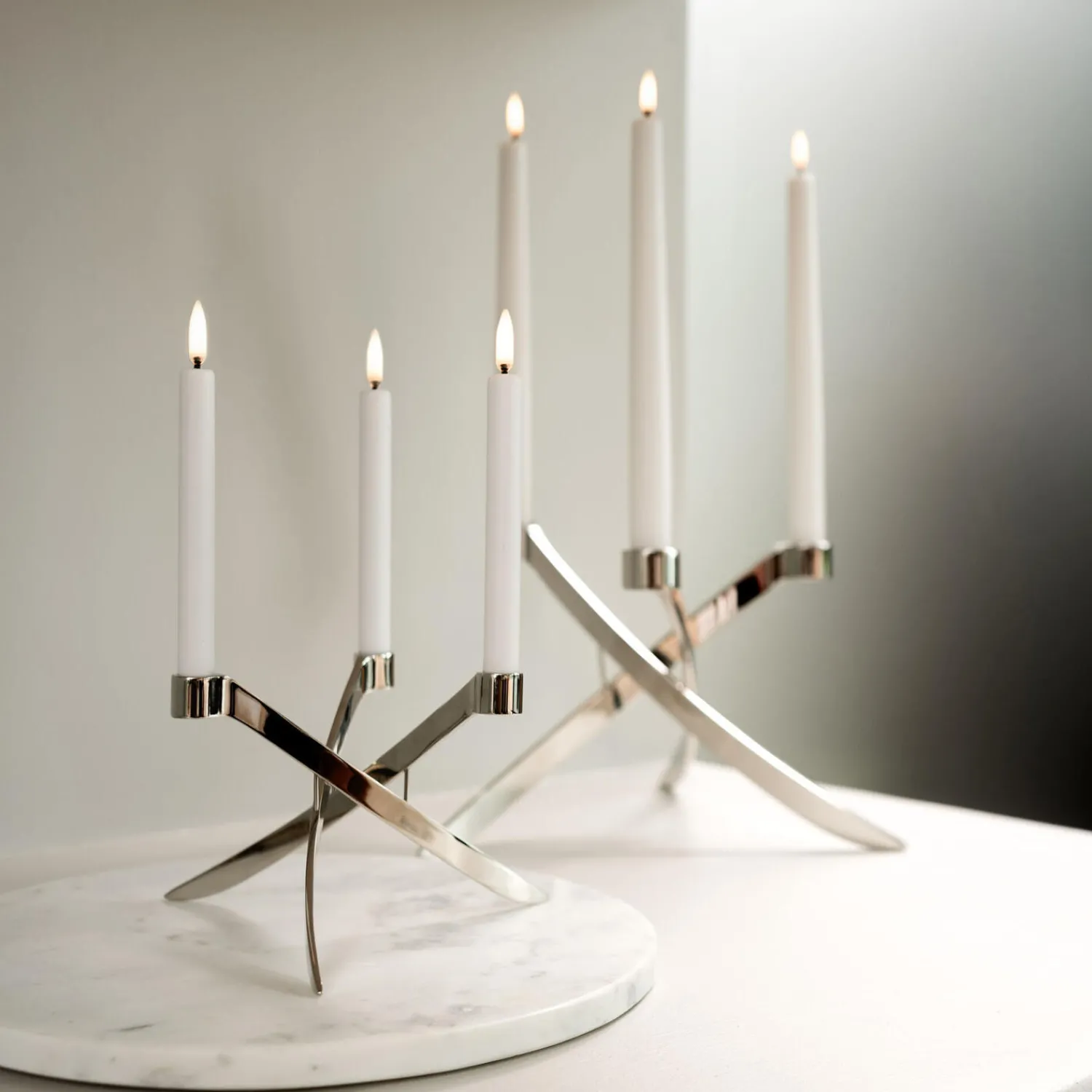The LightArch is a collection of individual candlestick arches that fit perfectly together in a number of ways to create a beautifully unique candlestick arrangement. Suitable for many different sized candles, a minimum of three single arches are required as a starting base and are available in mini or regular size in a choice of Chrome, Matte Black, or Rose Gold. Designed by Knud Holscher, one of the most influential designers in Scandinavia, who brings over 40 years of architectural and industrial design experience to his creations.
