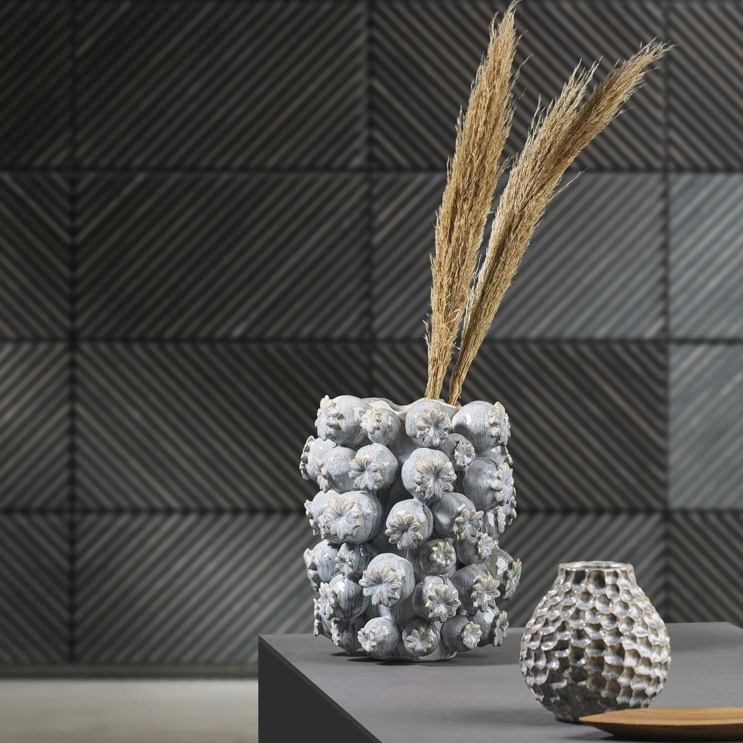 Virkelig flot og skulpturel stentøjsvase, der både er imponerende med en stor buket blomster og som en dekoration i sig selv. Vasen er dækket med smukke figurer formet som valmuefrøstande, disse er formet og sat på i hånden.