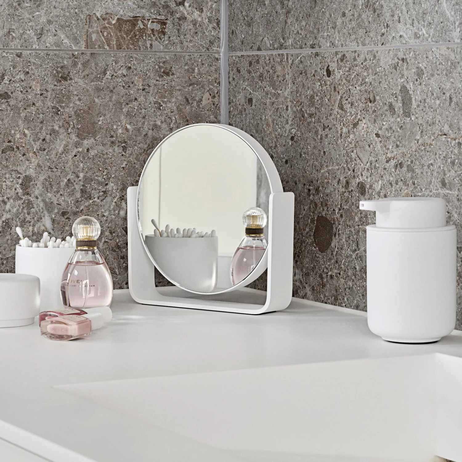Uundværligt bordspejl, der pynter, hvor end du placerer det. Den ene side er almindeligt spejl, mens den anden forstørrer hele fem gange. Spejlet roterer sikkert om egen akse, da det bæres af en bred aluminiumsramme, som samtidig udgør spejlets stabile base. Det er pulverlakeret og har et fint mat look. Spejlet glider smukt ind i den populære UME-serie og fås i alle 7 farver: Black, White, Soft Grey, Grey, Eucalyptus, Taupe, Olive Green.