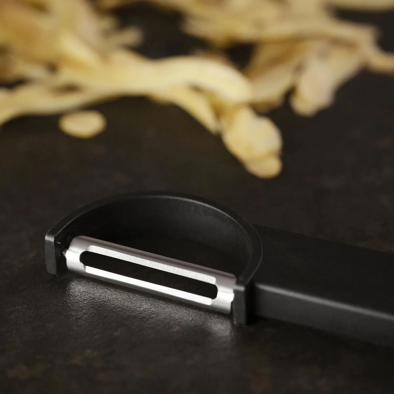 Effektivitet er i fokus, når du tager denne grøntsagsskræller frem fra køkkenskuffen. Det lille værktøj er en uvurderlig ven, når der hurtigt skal skrælles – uanset hvilken hånd, du foretrækker at bruge, eller hvilken retning, du vil skrælle i, væk fra eller imod dig selv. Klingen er lavet i knivskarpt kvalitetsstål, og grebet er godt.