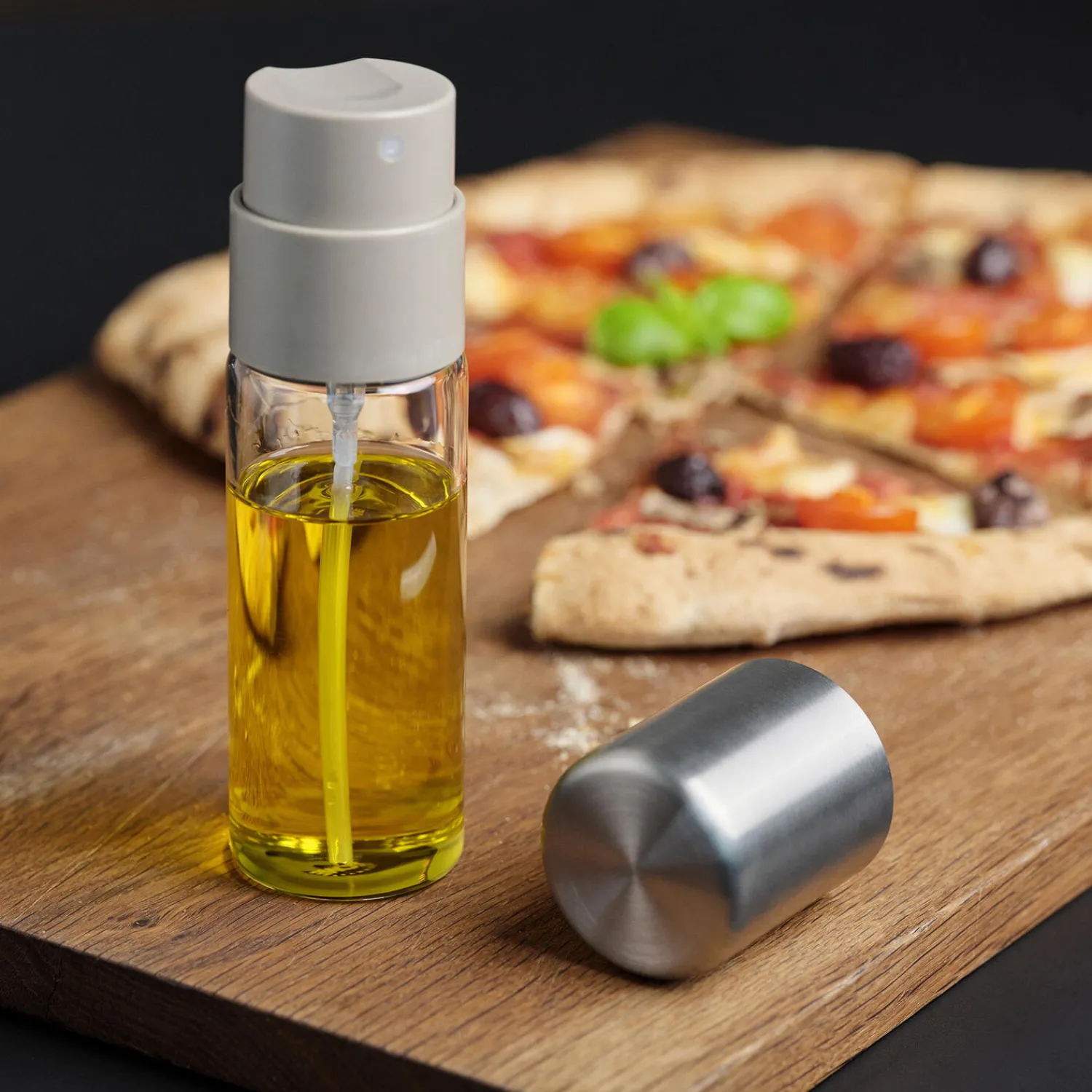 Stilren oliespray, der gør livet lettere og mange ting lækrere. Med få tryk kan du fordele olie på salaten, panden eller i brødformen. Du kan også lave din egen krydderolie med en kvist timian eller rosmarin og nyde synet, mens olien samler smag. Oliesprayen er nemlig udført i glas, så du har indkig til indholdet. Dekorativt og praktisk på én gang. VE2 er designteamet bag det lille hverdagsmesterværk, der er udført i glas med taupe-farvet pumpehoved og låg af stilrent stål.