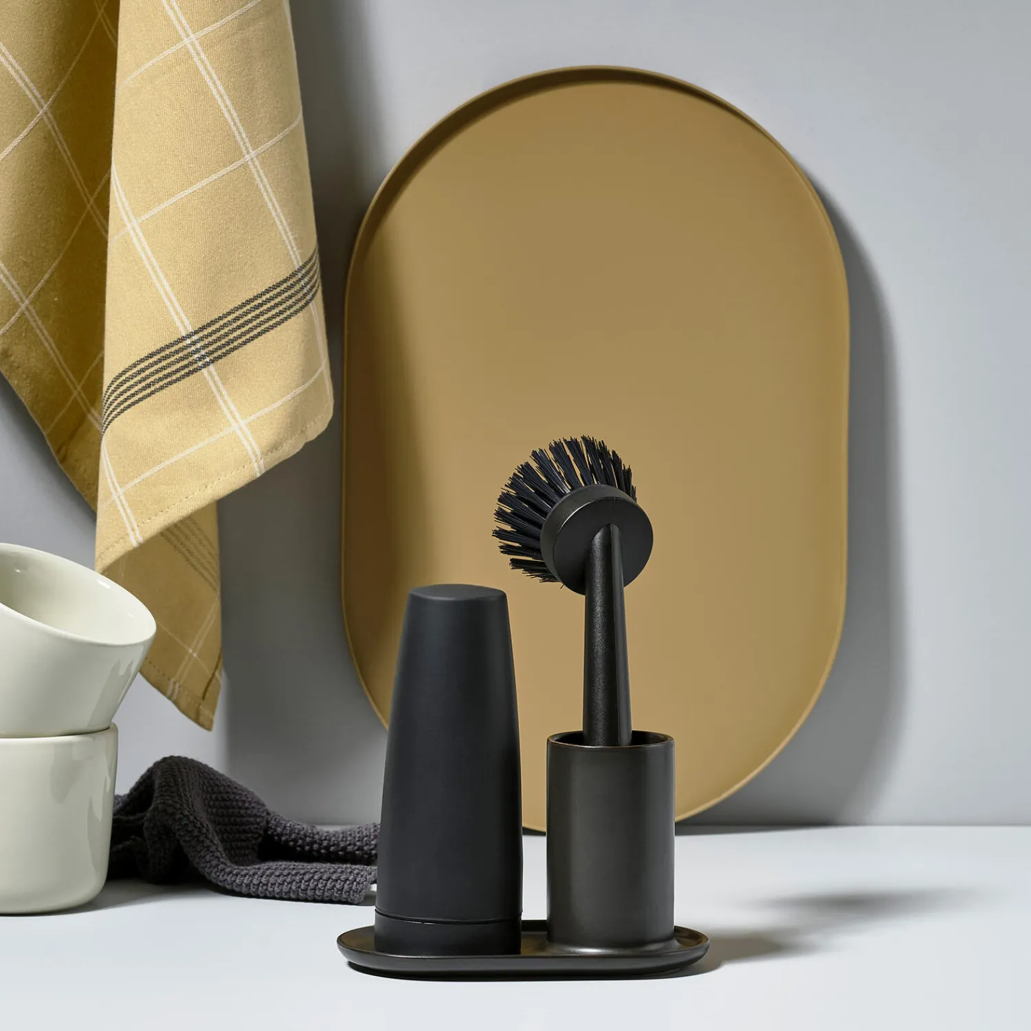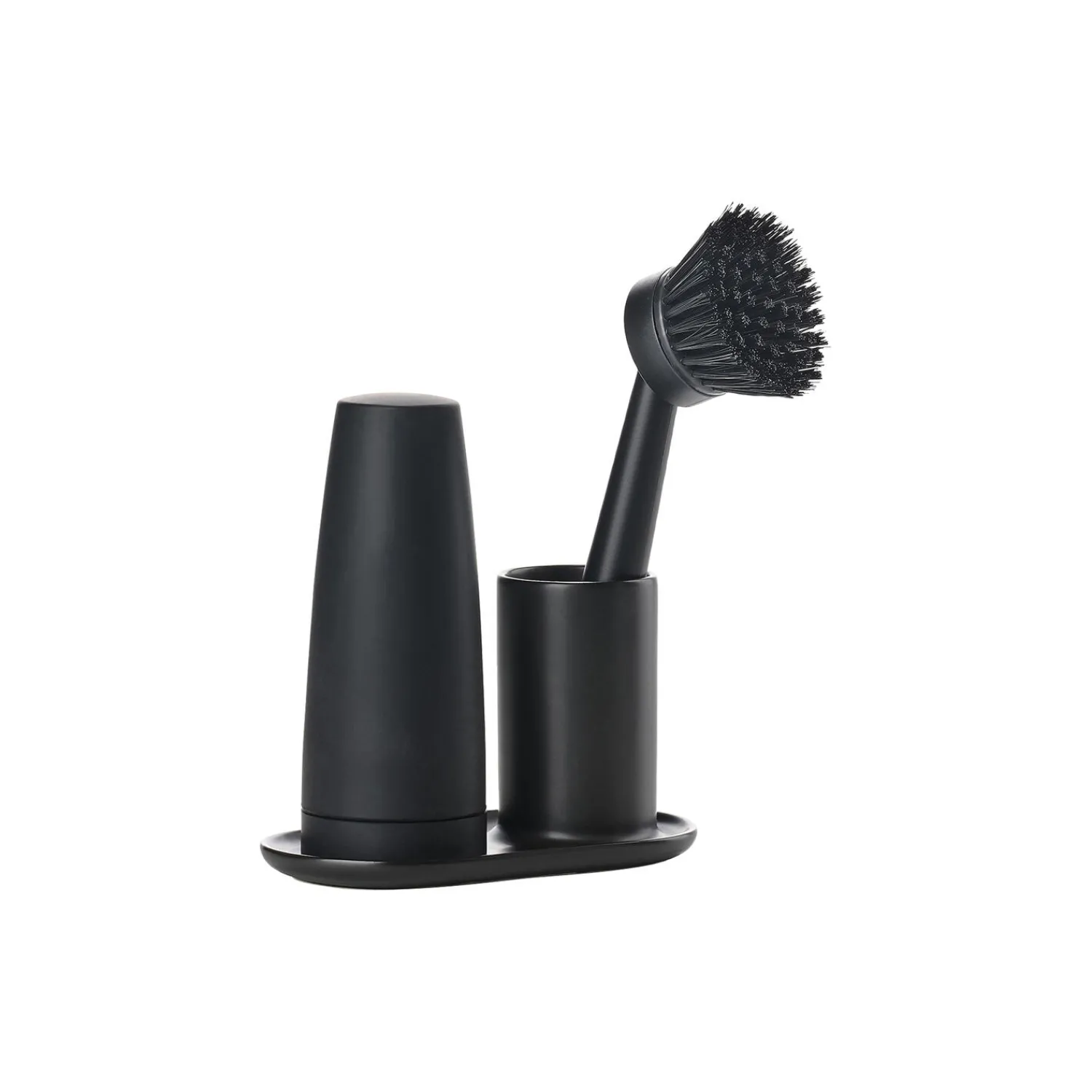 Enkelt, handy og helt diskret opvaskesæt fra Singles. Holderen af keramik kan sættes i opvaskemaskinen, og du kan udskifte børstens hoved. Den løse dispenser doserer sæben med et let tryk og sættes herefter tilbage på plads.