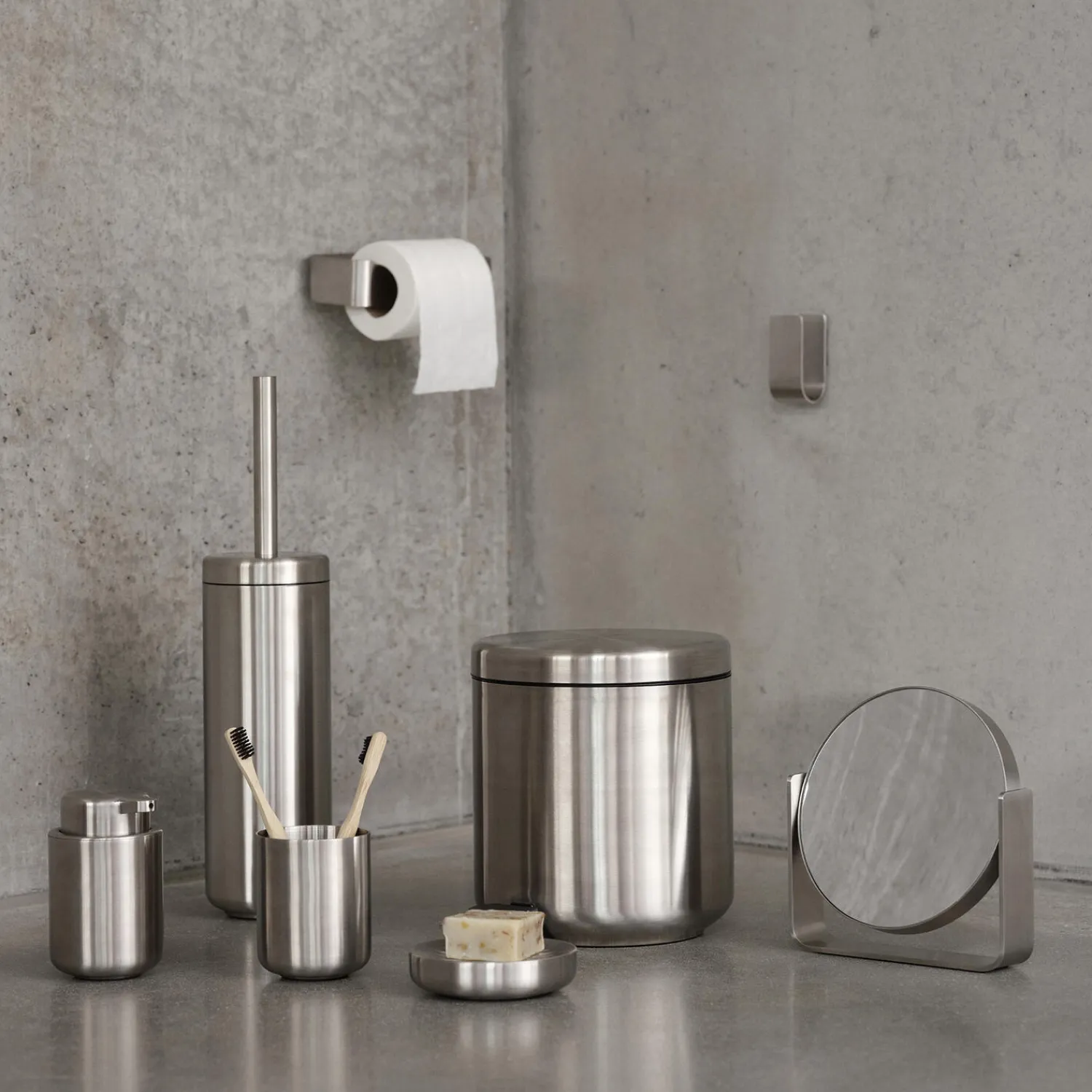 Den velkendte UME U-form går igen i toiletrulleholderen til væggen. Solid, men samtidig svævende let. Skjult ophæng, nem montering, rulleskift med et snuptag. Hvad mere kan man ønske sig?Vælg mellem 9 forskellige nuancer samt rustfrit mat stål. UME-serien har i flere år været et centralt ikon i Zones badkollektion. Nu udkommer serien i et eksklusivt nyt materiale, nemlig mat stål. Et oplagt valg til badeværelser og toiletter alle steder, hvor funktion og æstetik er i højsædet. De bløde organiske former får smukt modspil fra det stilrene og kølige stål i serien, som er skabt i samarbejde med designteamet VE2. I gulvhøjde byder serien på en mindre pedelspand samt toiletbørste i cylinderformet holder. Til væggen er der matchende toiletrulleholder samt kroge i elegant u-form med skjulte beslag. Til bordet findes både sæbedispenser, sæbeskål samt tandbørstekrus samt rundt bordspejl med vippefunktion. På trods af stålets mathed reflekterer lyset sig smukt i overfladen og giver overfladen liv og karaktér. Alt i alt en formfuldendt forvandling af en ægte Zone-klassiker.